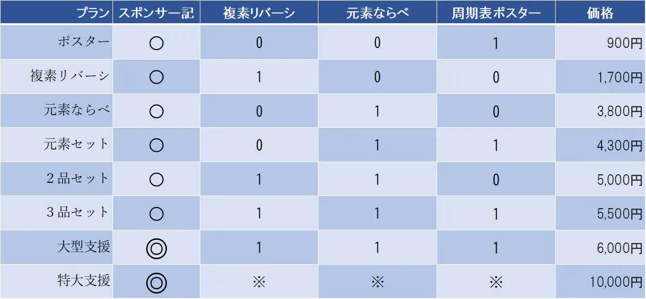 特大支援プランの※について。複素リバーシ,元素ならべ,周期表ポスターそれぞれの単価を1200円,3500円,500円としたとき、合計金額が10000円以下になる範囲でご希望の数量をお求めいただけます。