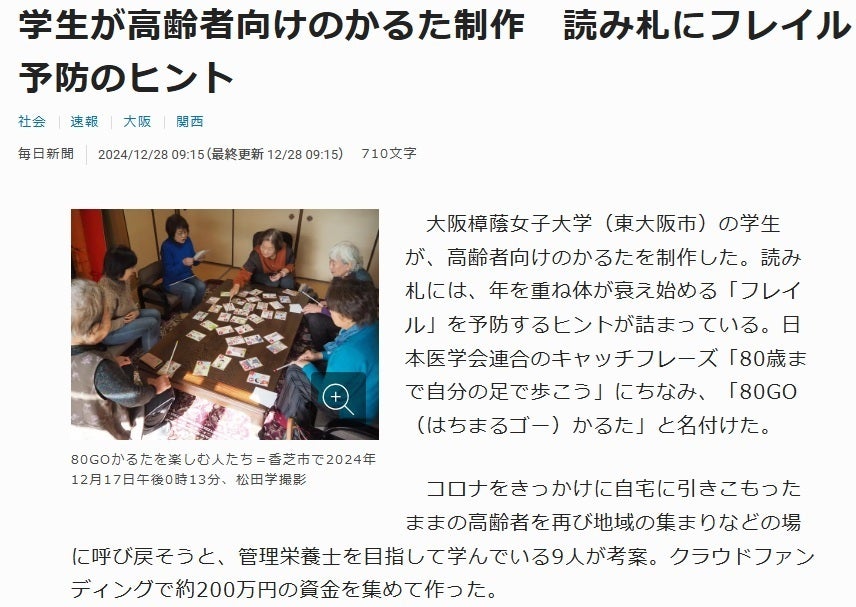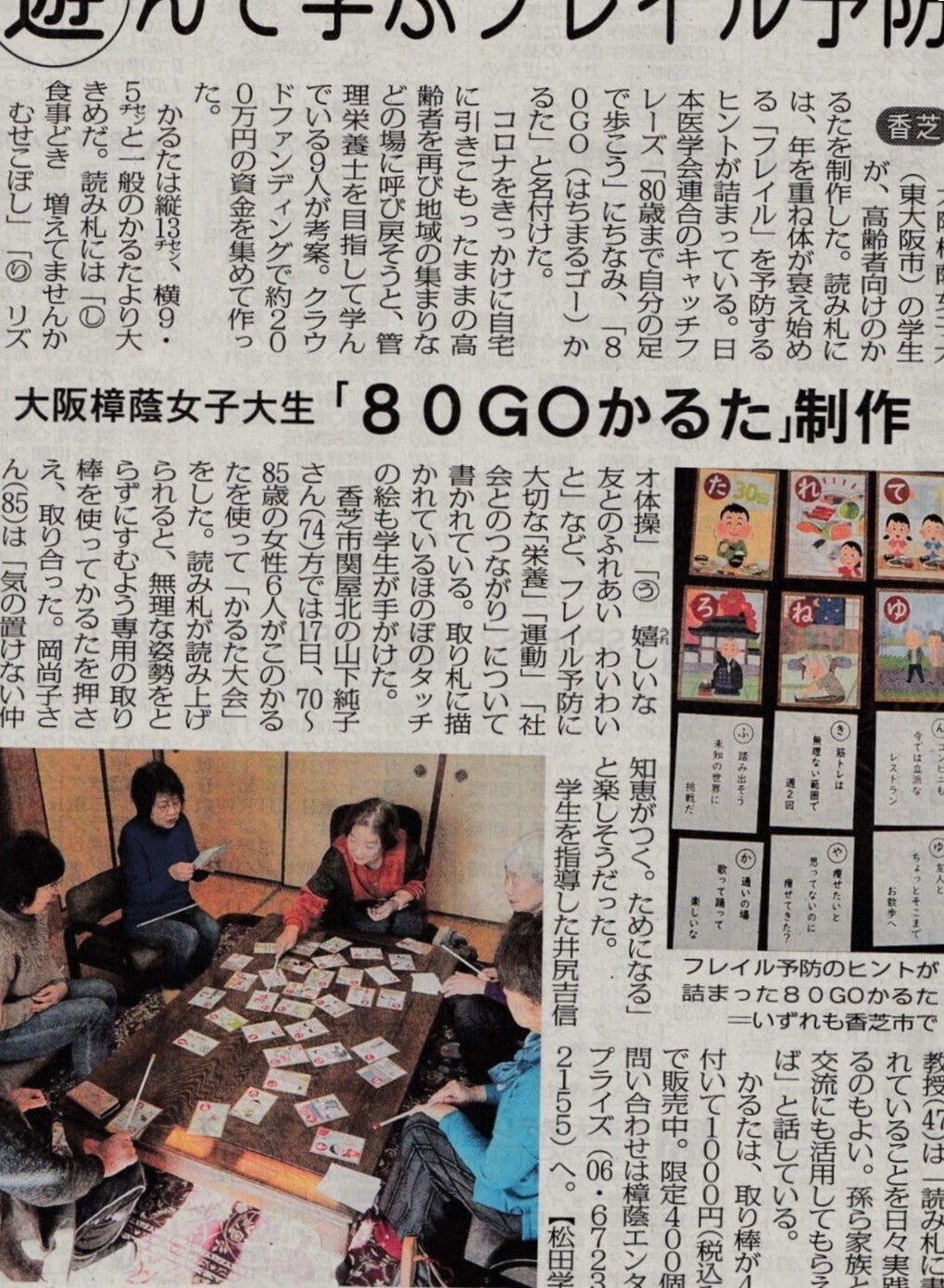 東大阪市社会福祉協議会 高井田老人センターCOW 坊下さんにはこれまで幾度となく80GOかるたを実施頂いています。地域担当の皆様も本当にありがとうございます!本会参加者からは『軽く体を動かして、頭をつかって、笑って、とても楽しかった』などなど地域包括の方からは『楽しく身につくのでとても刺激になっていい』『かるたの振り返りも大切だと思う』など多くの喜びの声を頂きました!また、昨日は毎日新聞大阪版にも記事がのり、昨日1日で30名からの注文が殺到(電話なりっぱなし、樟蔭エンタープライズさんごめんなさい)2月~3月にかけて、イベントを開催下さるところも増加中です!是非皆様のSNSからも喜びの声を発信頂き、一緒に80GOかるたを育ててやってください!