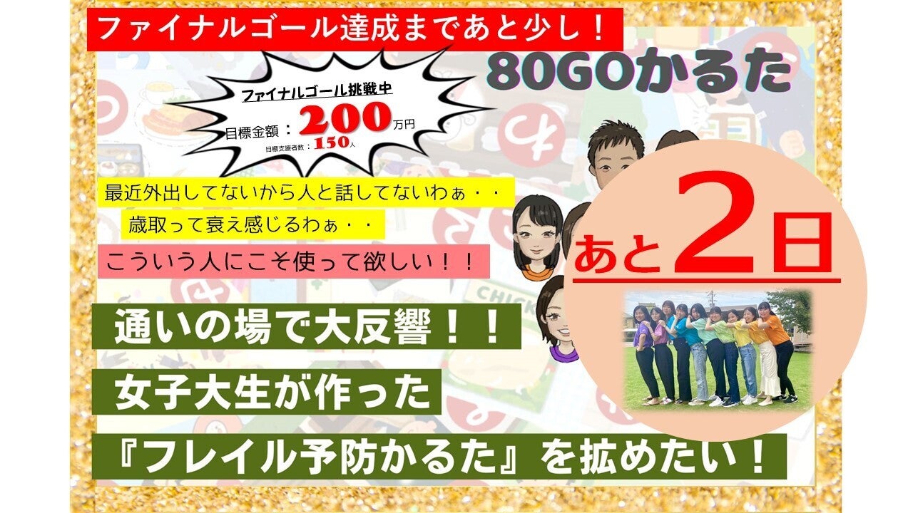 お陰様で昨日、セカンドゴールを達成しました!このメールを見て頂いている支援者の皆様、本当にありがとうございます!クラファン終了まで、残り15日。★日本全国の介護レクを実施されておられる皆様★医療・介護・福祉に携わる専門職の皆様にとにかく知ってほしい。是非ともこのメールを見て下さっている皆様から上記★の方々へ向けて情報拡散をお願いします。もちろん、『面白そうな”かるた”あるみたいやで~』で十分です。現在の総支援者数117名 → 200名越えを目指しています。まだまだ走ります~~
