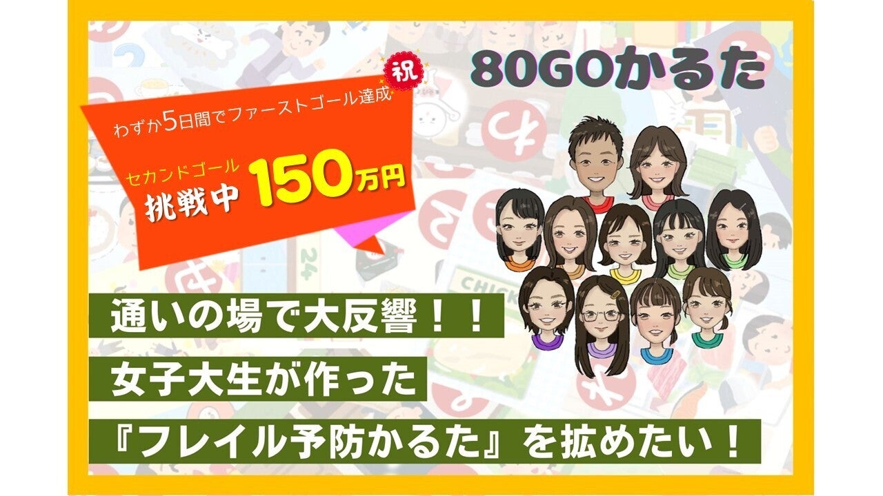 皆様の温かいご支援を頂き、支援募集開始5日目にしてファーストゴール(80万円)を達成しました!!激励・応援のメッセージの数々に日々感謝と感動の連続です(涙)。この「80GOかるた」に込められた”熱い想い”を必ずや届けたい!!日本全国の地域在住高齢者様のフレイル予防に貢献できる日を夢見て努力を重ねていきます!引き続きのご支援、FacebookやInstagramなどでの大拡散をどうぞ宜しくお願いします!皆様からのご支援を頂ければ頂くほど、安価での販売が実現します。そうなれば、予算が限られている地域の老人会や小サークルでもご購入が実現するかと思います。どうぞどうぞ、よろしくお願いします!