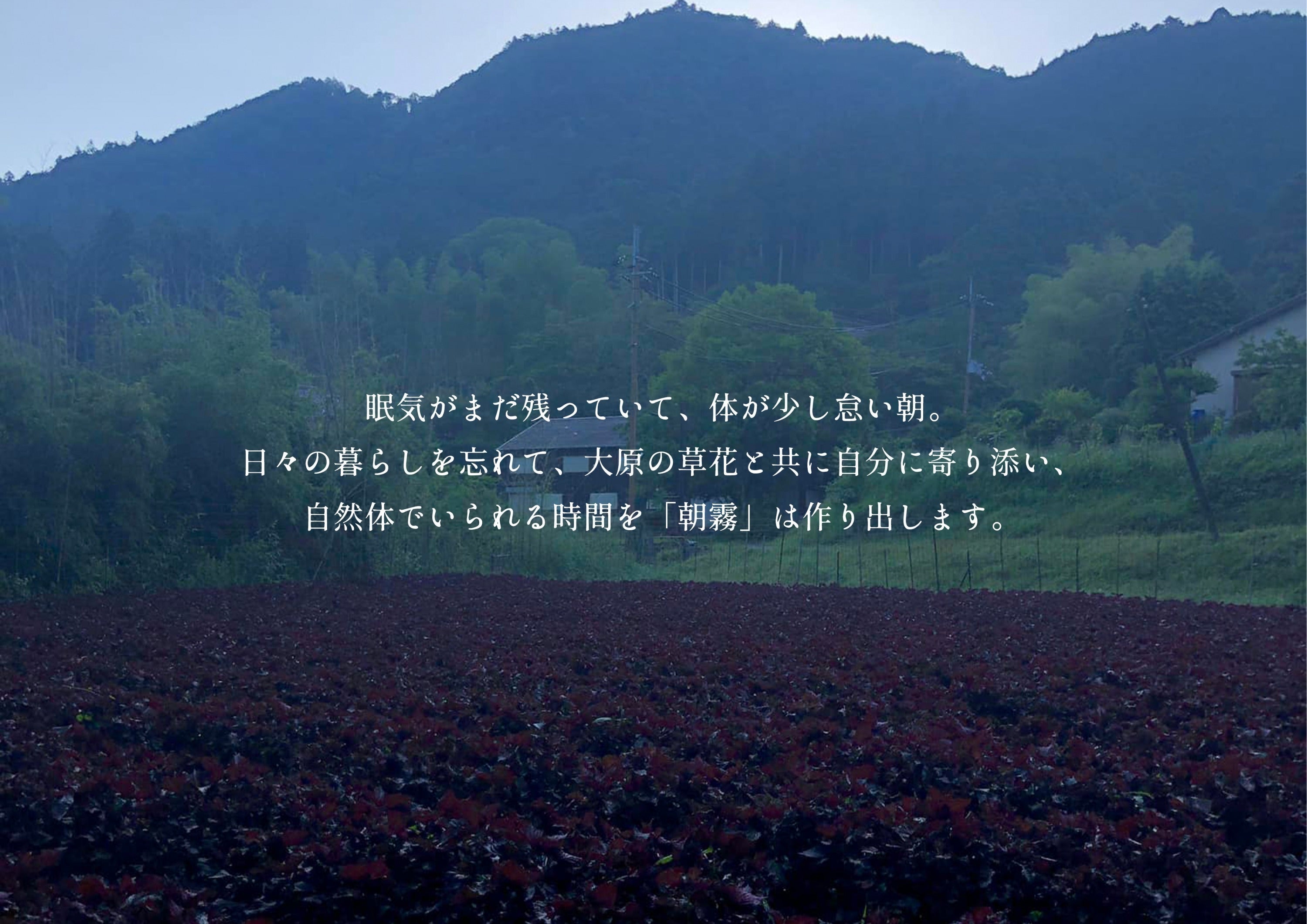 このプロジェクトは、京都の自然の恵みを生かした「朝霧」のポプリを通じて、皆さまの日常に里山の情景を感じるひとときをお届けしたいと願っています。