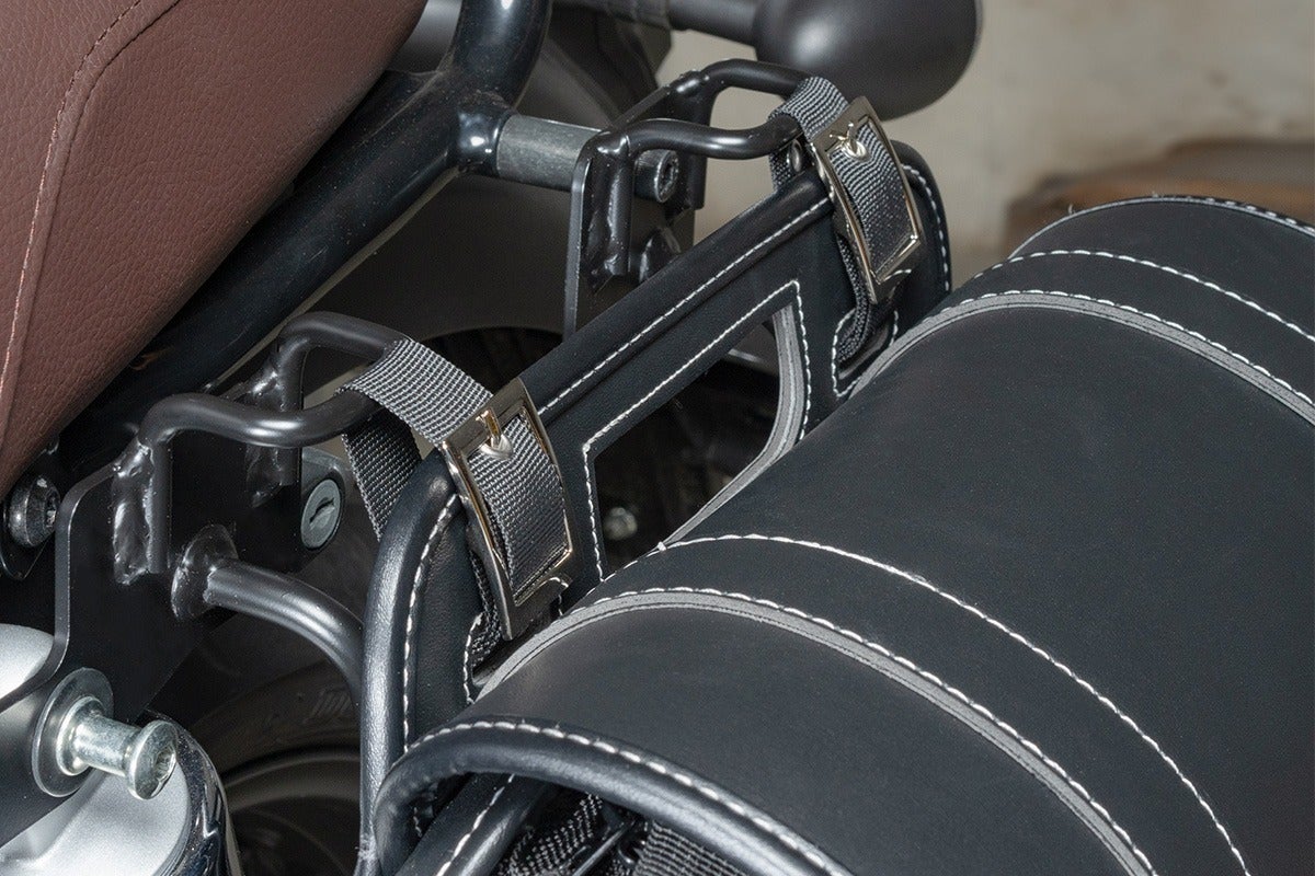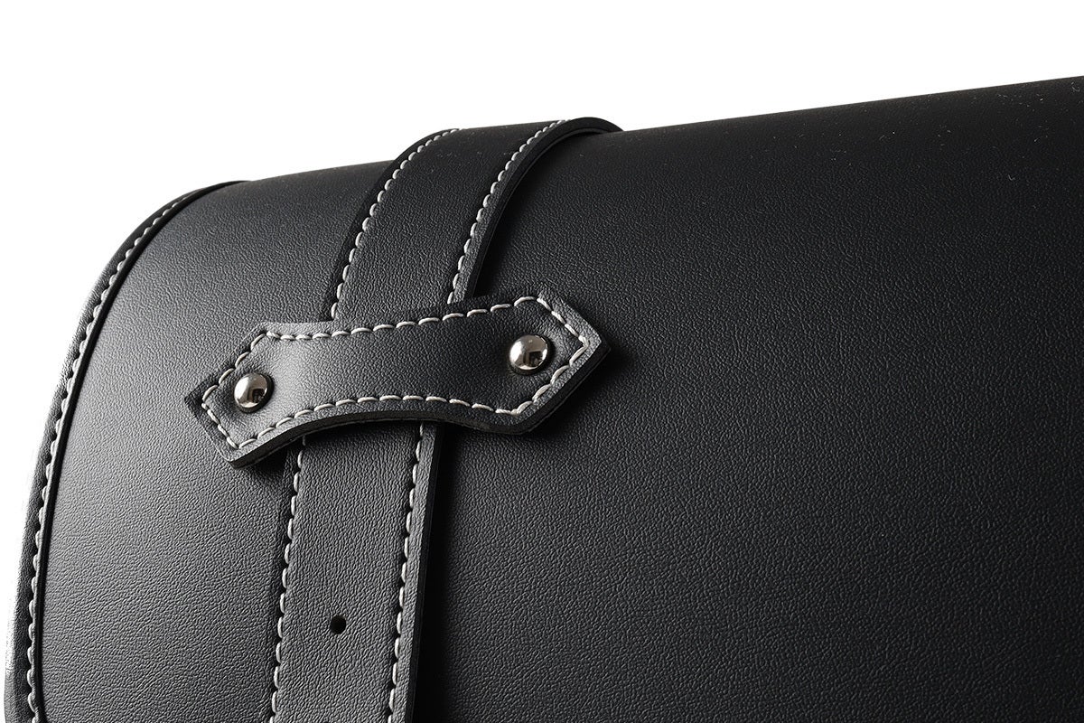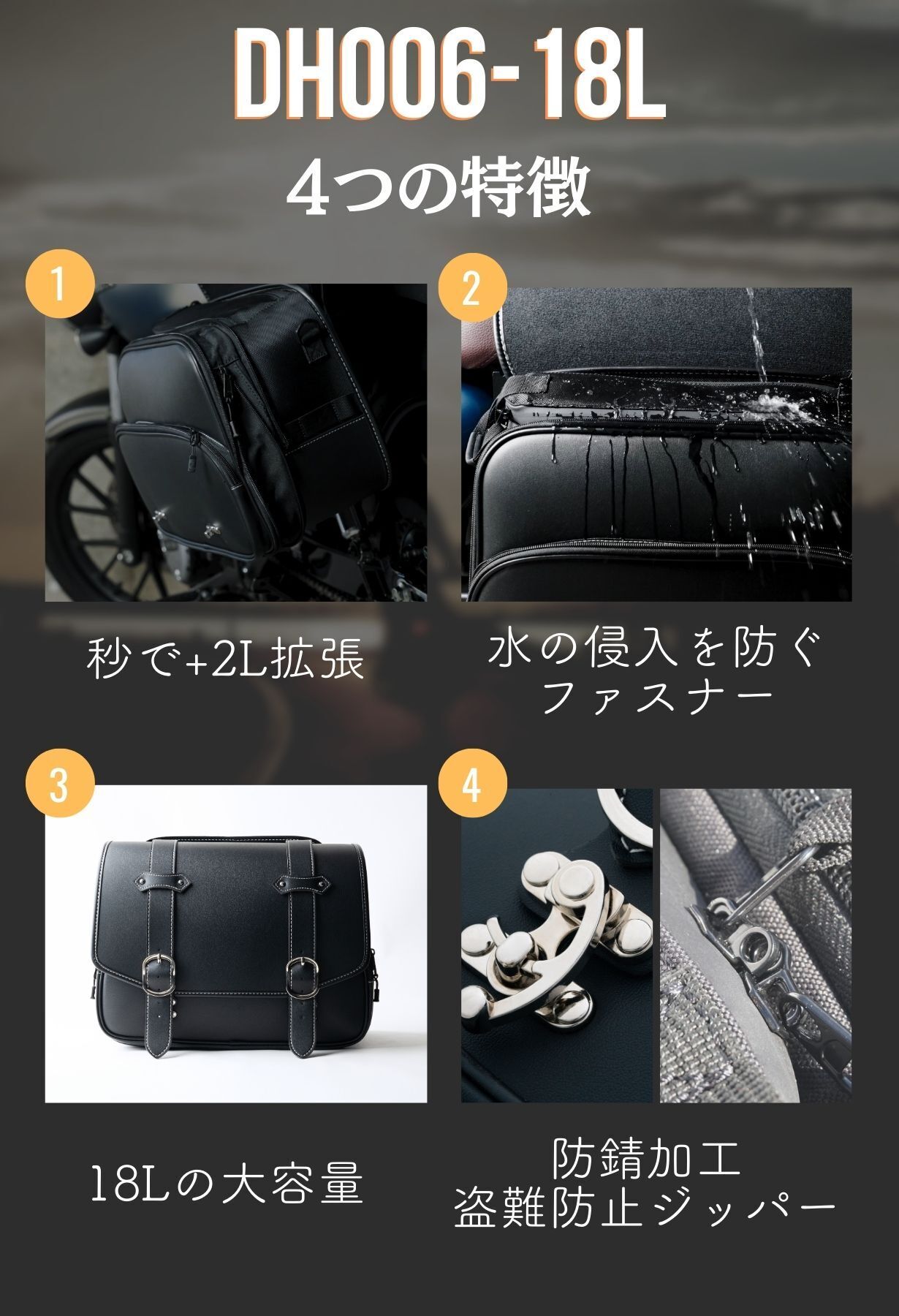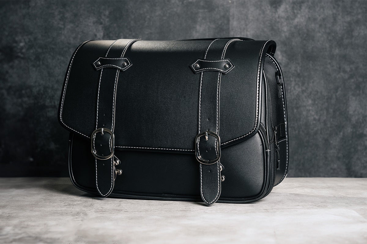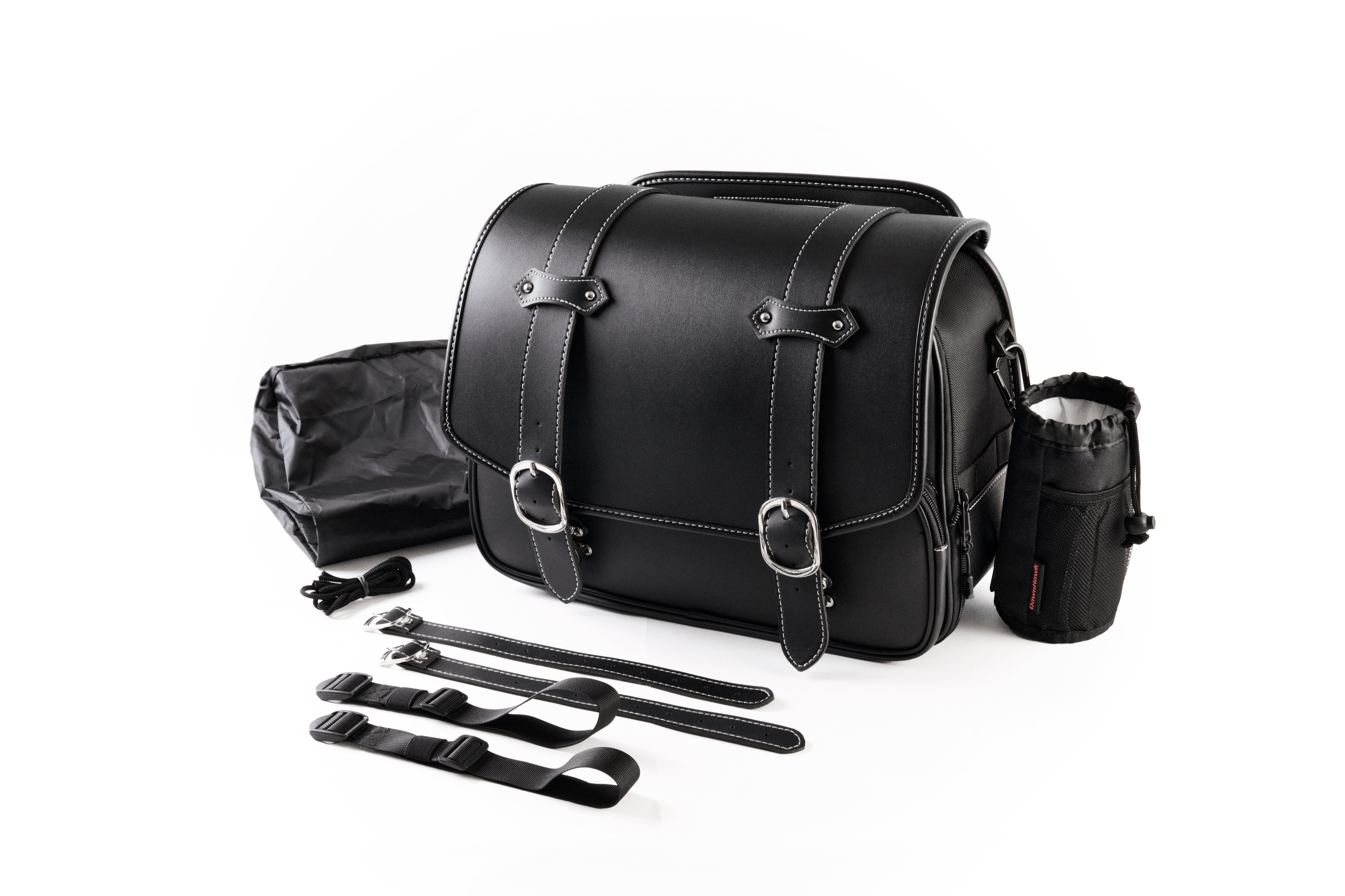 シンプルな白ステッチとブラックスタイルで、特にアメリカンやクラシックバイクにぴったりのデザイン。野外を想定した機能を採用し、旅先で急遽荷物が増えた時にも対応できる+2Lの拡張収納力と多少の雨でも問題ない仕様に設計。これ一つで、長距離ツーリングも快適!