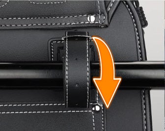 ①付属のベルトを予めサポートに装着し、ベルトとバッグを取り付けします。