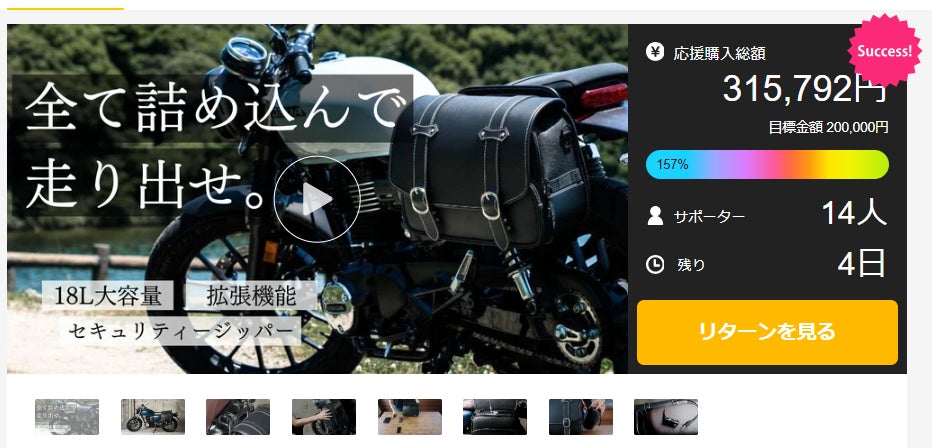 現行モデルである9Lサイドバッグは販売しており、このプロジェクトを通じて、サイズバリエーションを増やして、よりバイクライフをより豊かにする新しい商品ラインナップ揃えバイク用品ブランドを確立したいと考えています。