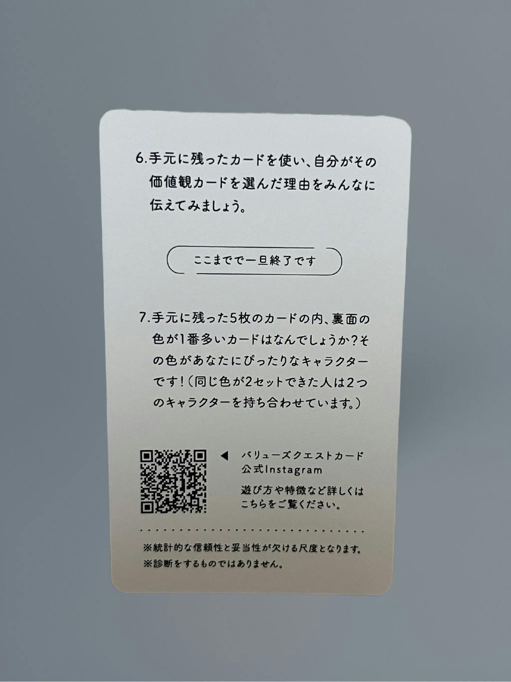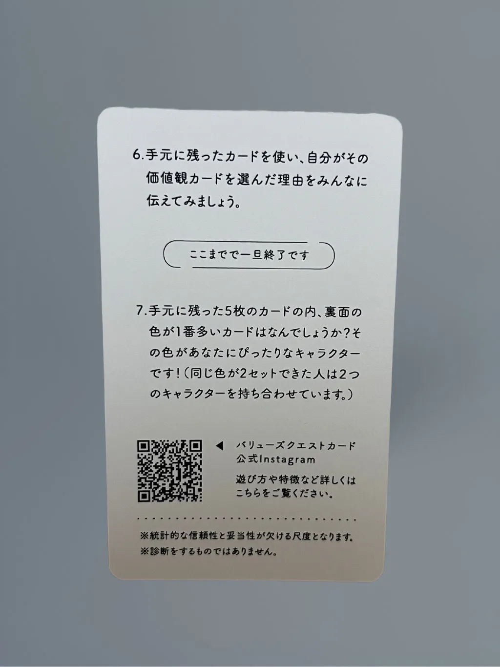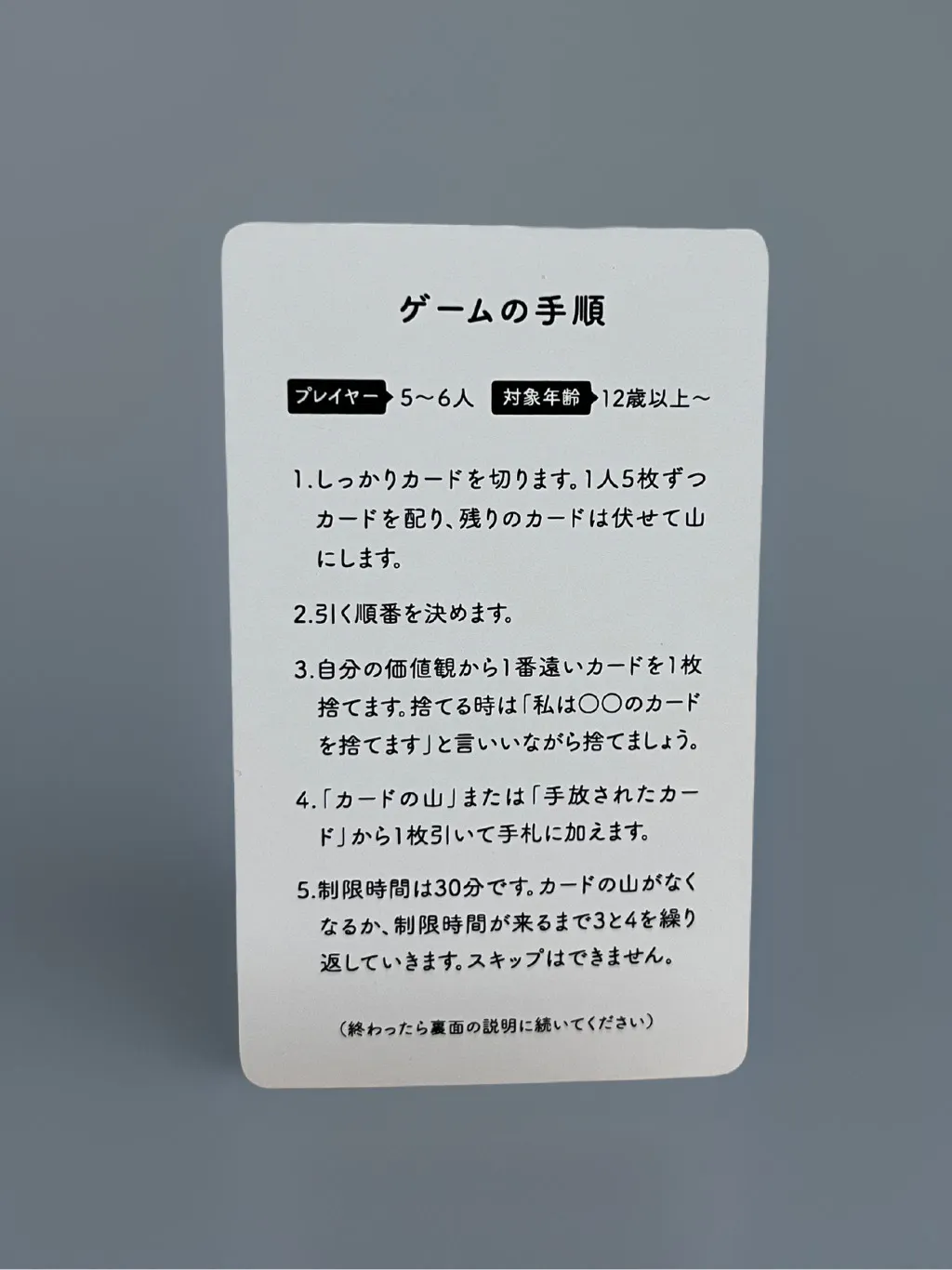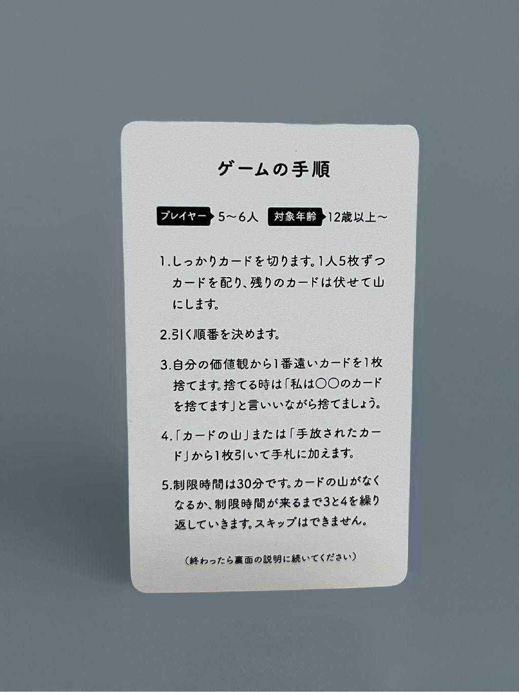 このカードゲームは、家族や友人、会社の同僚、スポーツチームなど、さまざまな場面で活用できます。皆様がこのゲームを通じて、より深いコミュニケーションを築き、自分自身や他者の価値観を理解する一助となれば幸いです。