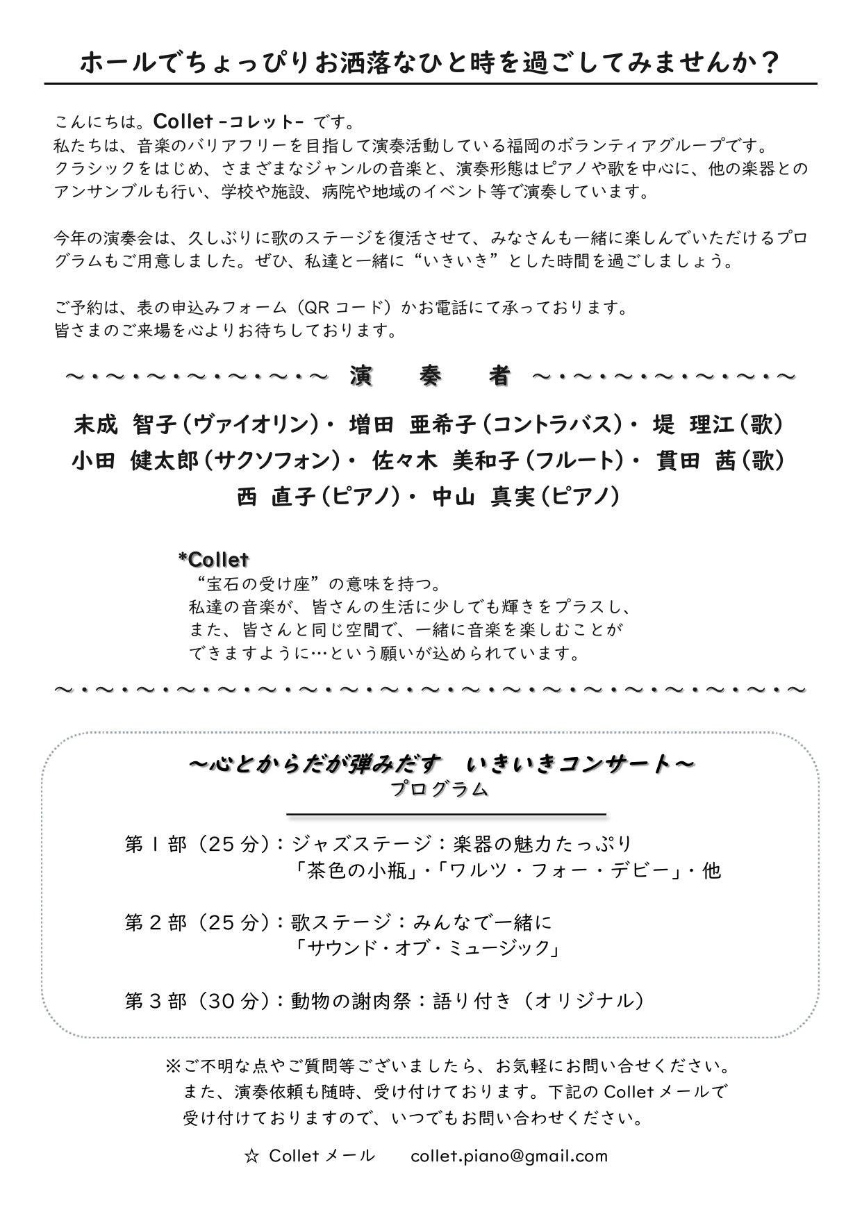 私たち Collet~コレット~ は、音楽のバリアフリー(どんな方でも一緒に楽しめる音楽)をモットーに活動しています。学校や施設、病院や地域のイベント等に出張演奏した折、頂いた交通費や謝礼を大切に積み立てて、入場無料のコンサートを行っています。
