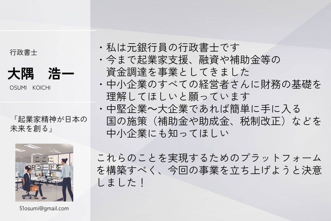 私は元銀行員で現在行政書士を営んでいます。主に補助金や融資など資金調達のアドバイスをしています。特に起業家支援を数多く手掛けてきました。