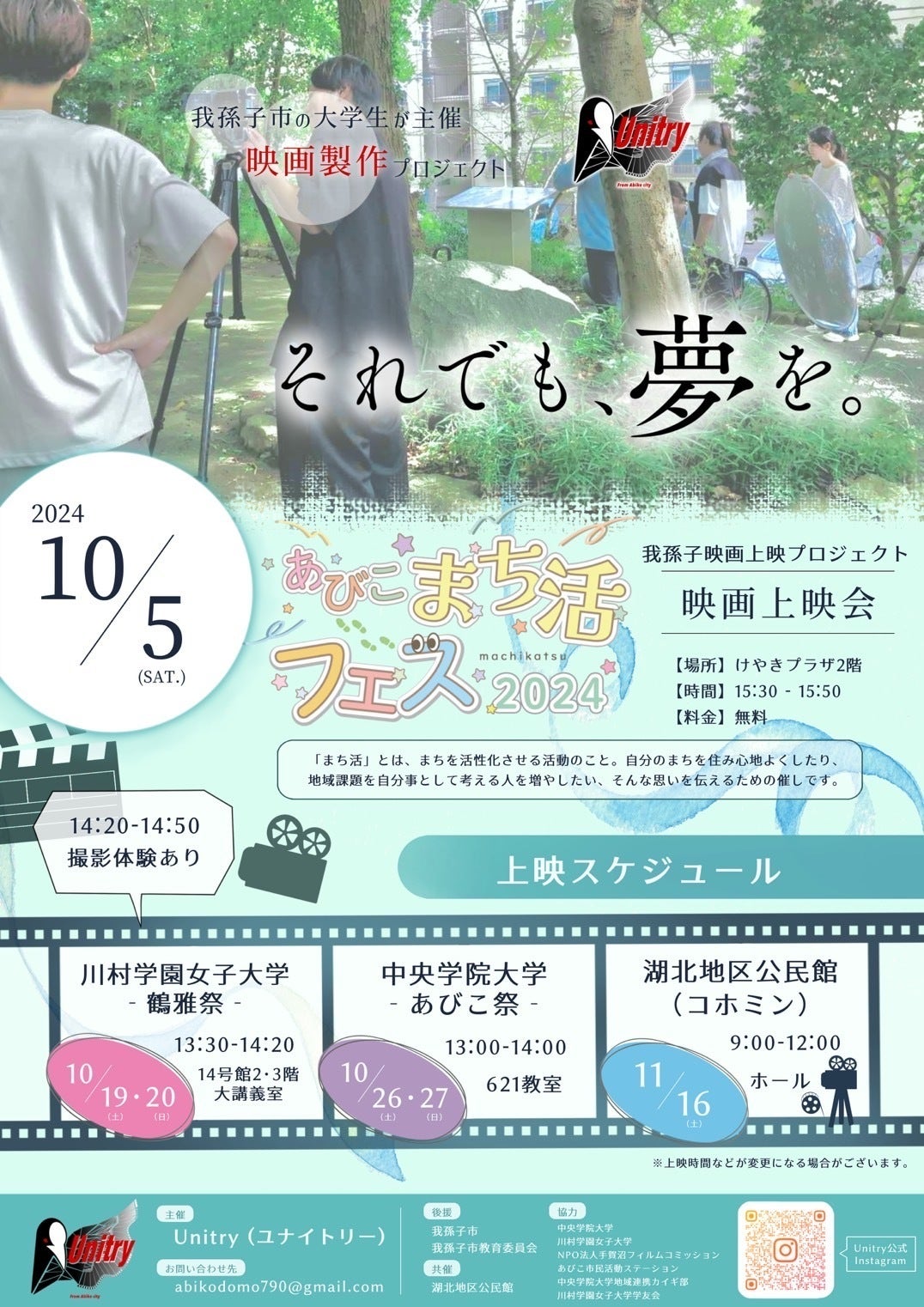 皆様いつも温かいご支援をいただき、誠にありがとうございます。10月26日(土)と27日(日)に、中央学院大学の学園祭である「あびこ祭」があり、映画の上映会を行いました。上映会には両日ともにたくさんの方にお越しいただき、映画を見ていただきました。日曜日にはTossiさんと竹田優海さんによる主題歌「今」のライブパフォーマンスが行われ、素敵なギターの音色と美しい歌声が会場を包み込みました。映画や主題歌のライブパフォーマンスを見に来てくださった皆さま、ありがとうございました!我孫子をもっと盛り上げたい。引き継ぎ、我孫子映画制作プロジェクトへの応援のほどよろしくお願いします。→Instagramはこちらからhttps://www.instagram.com/ab_film_24?igsh=anRuZG1sOW1wZWdp&utm_source=qr