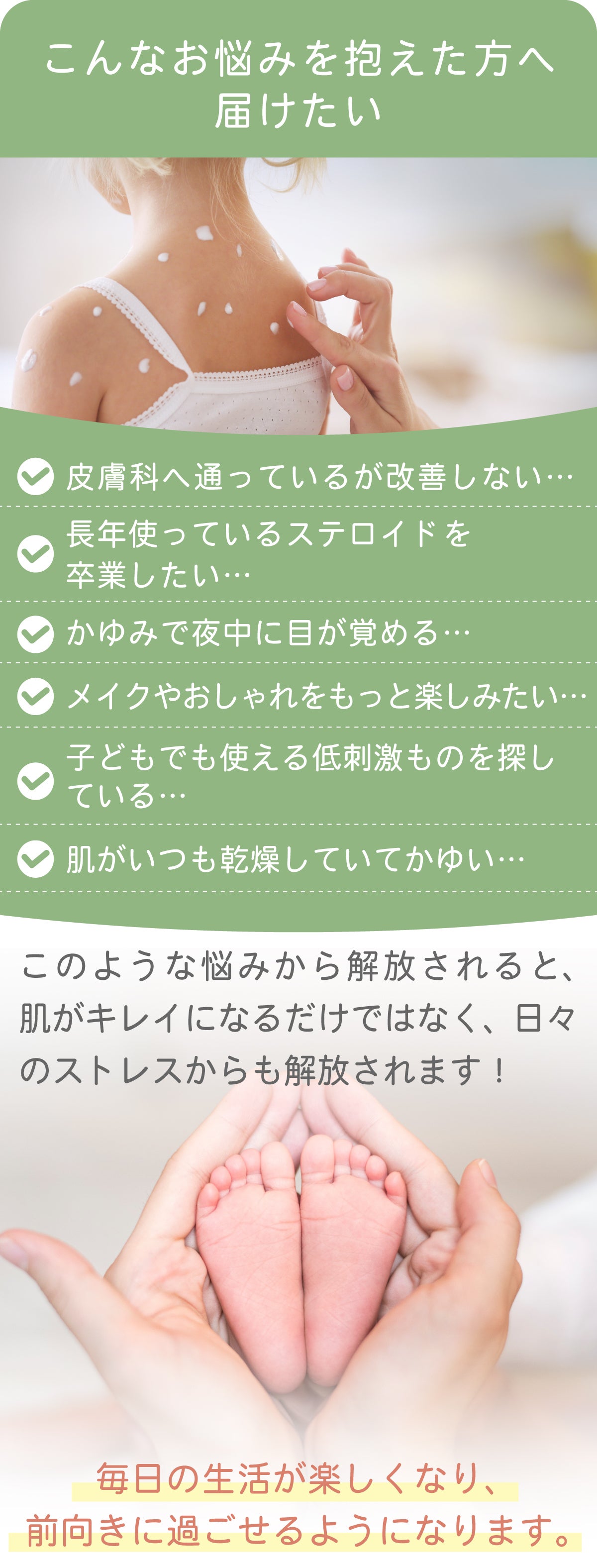 そして、アトピーや敏感肌、ニキビ肌で悩んでいる方々に笑顔が増えることを願っています。是非一度ご体験くださいますよう、よろしくお願い申し上げます。
