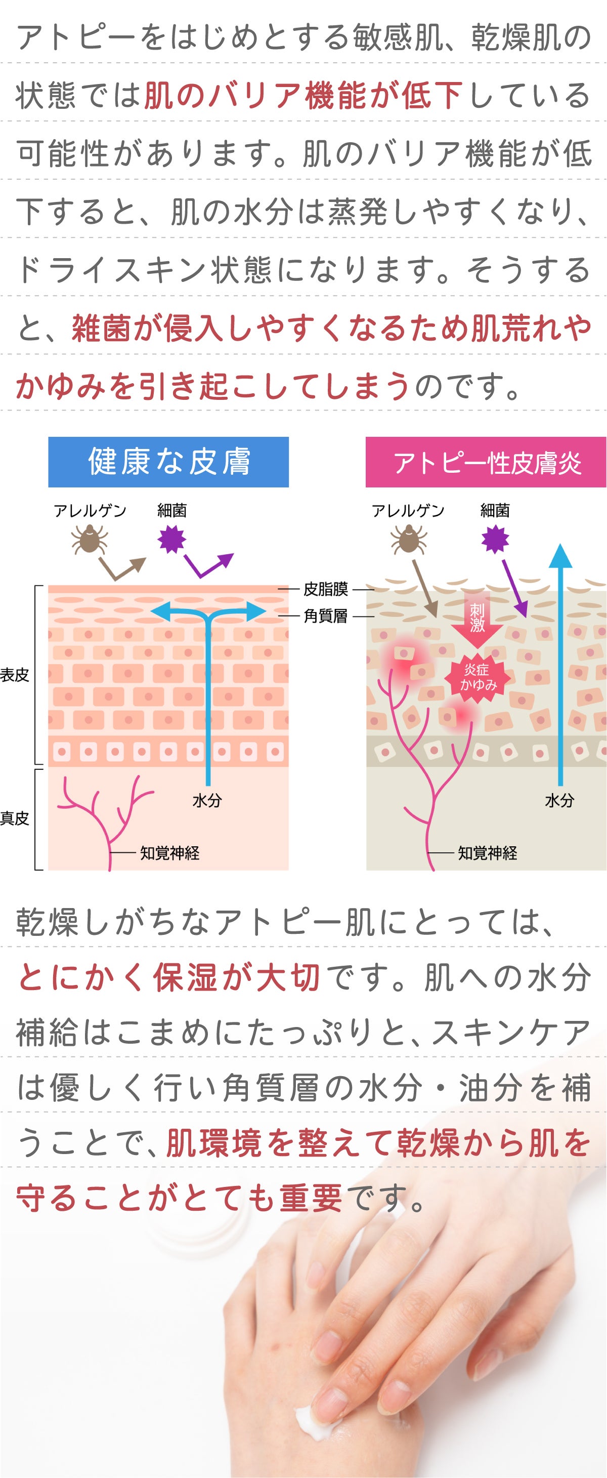 A.医薬品ではないため、直接アトピーを治すものではありません。肌質の環境を整えることで、自然な肌づくり、トラブルを起こしにくい肌作りをサポートします。