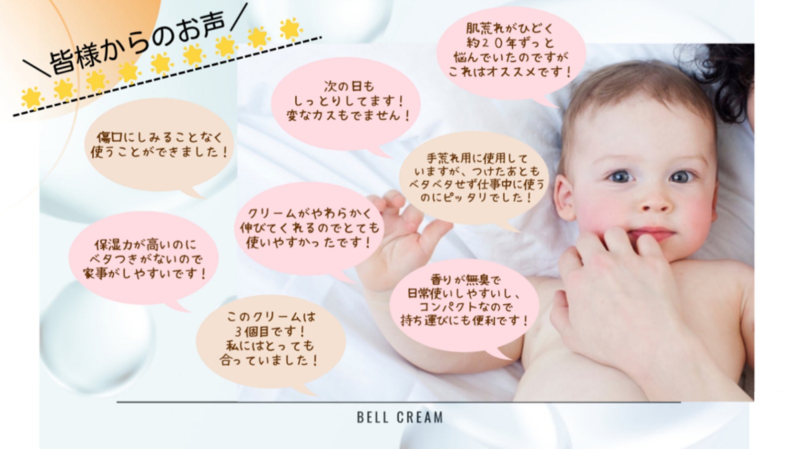 ・全成分:水、グリセリン、BG、スクワラン、ホホバ種子油、ベへニルアルコール、ステアリン酸、ペンチレングリコール、ミリスチン酸ポリグリセリルー10、トリエチルヘキサノイン、ワセリン、パルミチン酸セチル、ミツロウ、ステアリン酸グリセリル、ステアリン酸ソルビタン、ジメチコン、ポリソルベート80、プロピルパラベン、グリチルレチン酸ステアリル、メチルパラベン、トコフェロール、酢酸トコフェロール、乳酸桿菌/セイヨウナシ果汁発酵液、マンダリンオレンジ果皮エキス、ヒアルロン酸Na、加水分解コンキオリン、フェノキシエタノール、水溶性コラーゲン