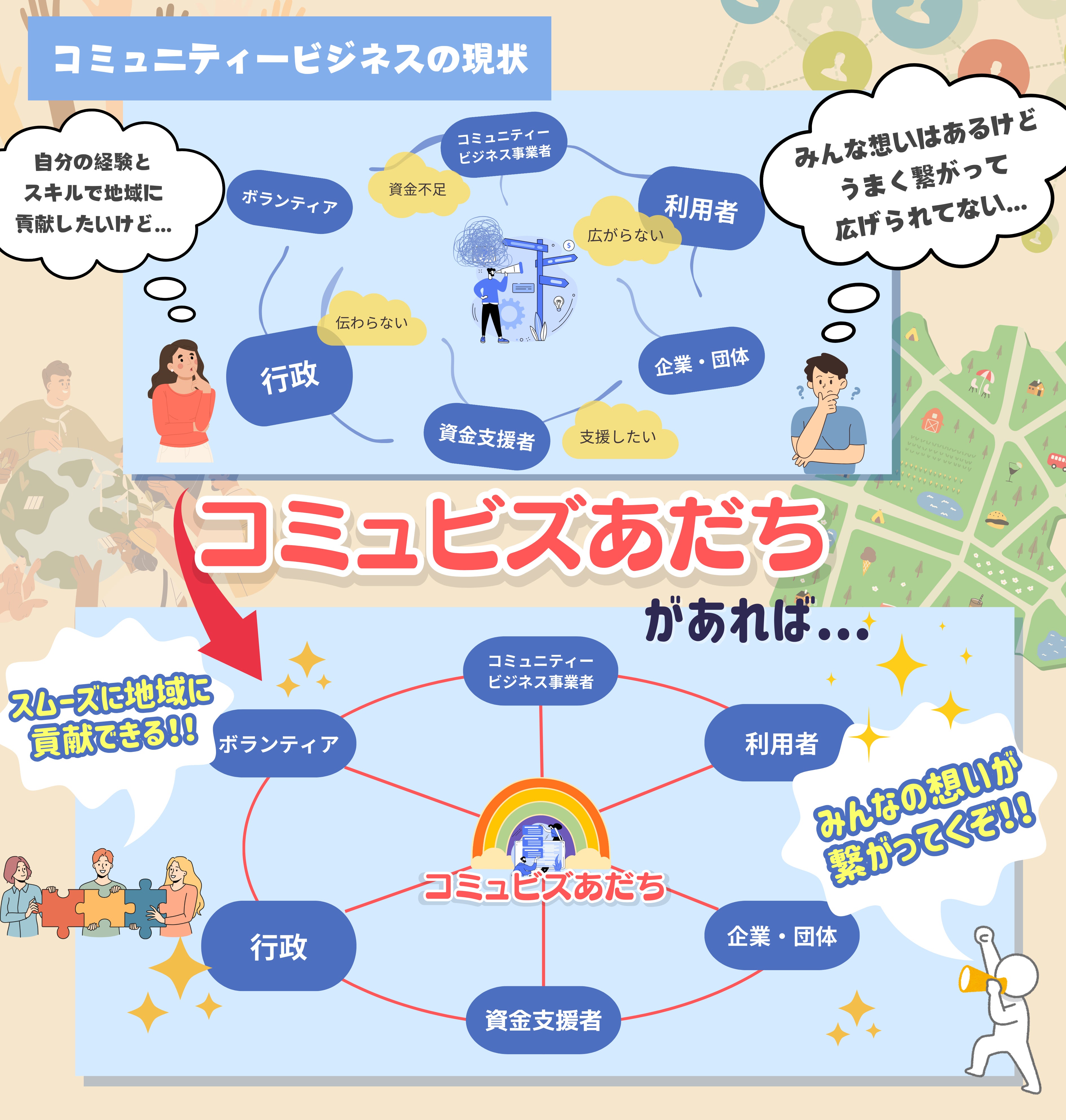 ◆私たちの目標は、足立区のコミュニティビジネスを紹介し、その活動を広めるためのポータルサイトを制作することです。このサイトを通じて、地域住民・団体や支援をしたい企業がコミュニティビジネスに気軽にアクセスし、参加できる環境を整え、地域全体の活性化を図ります!