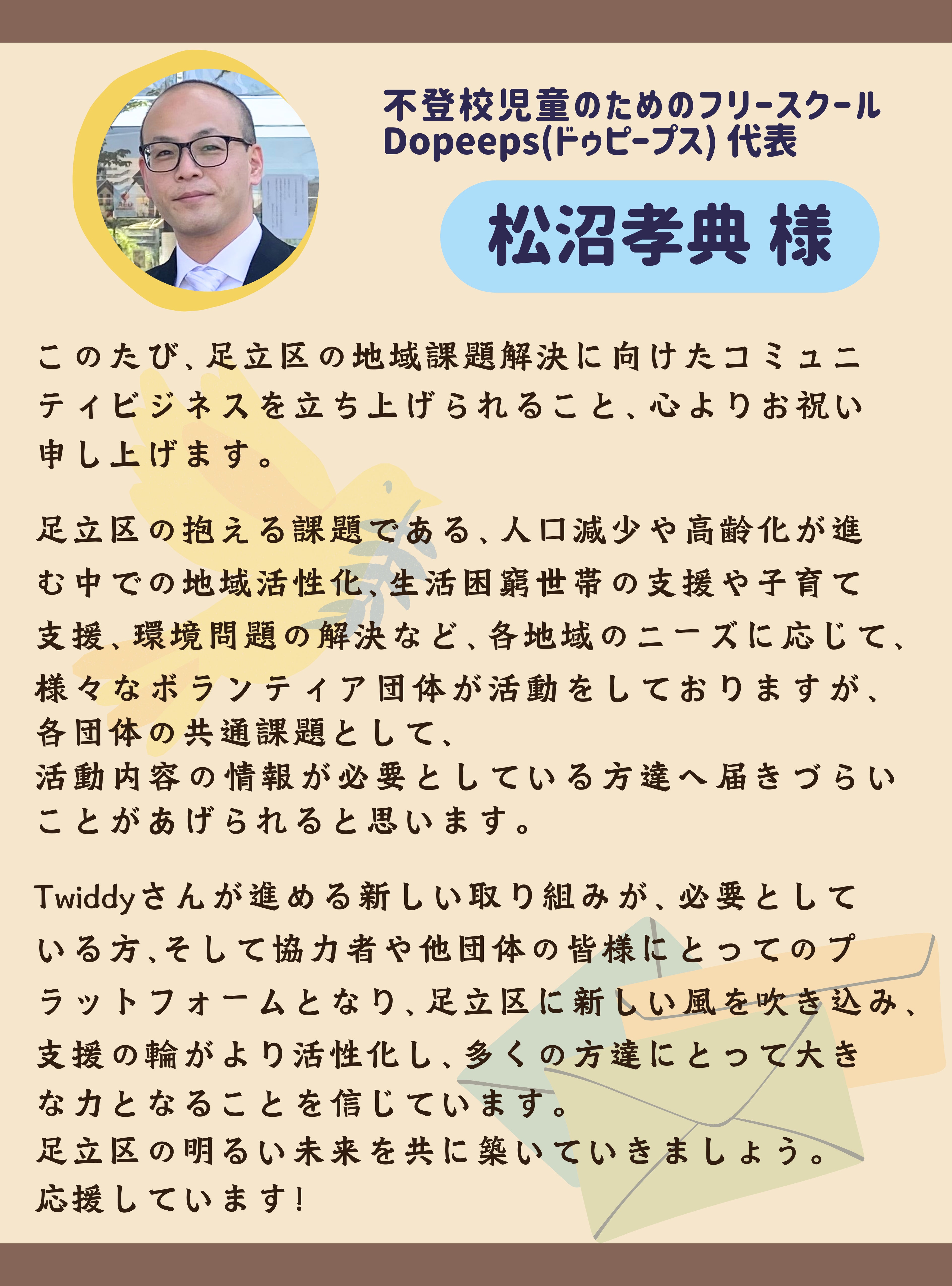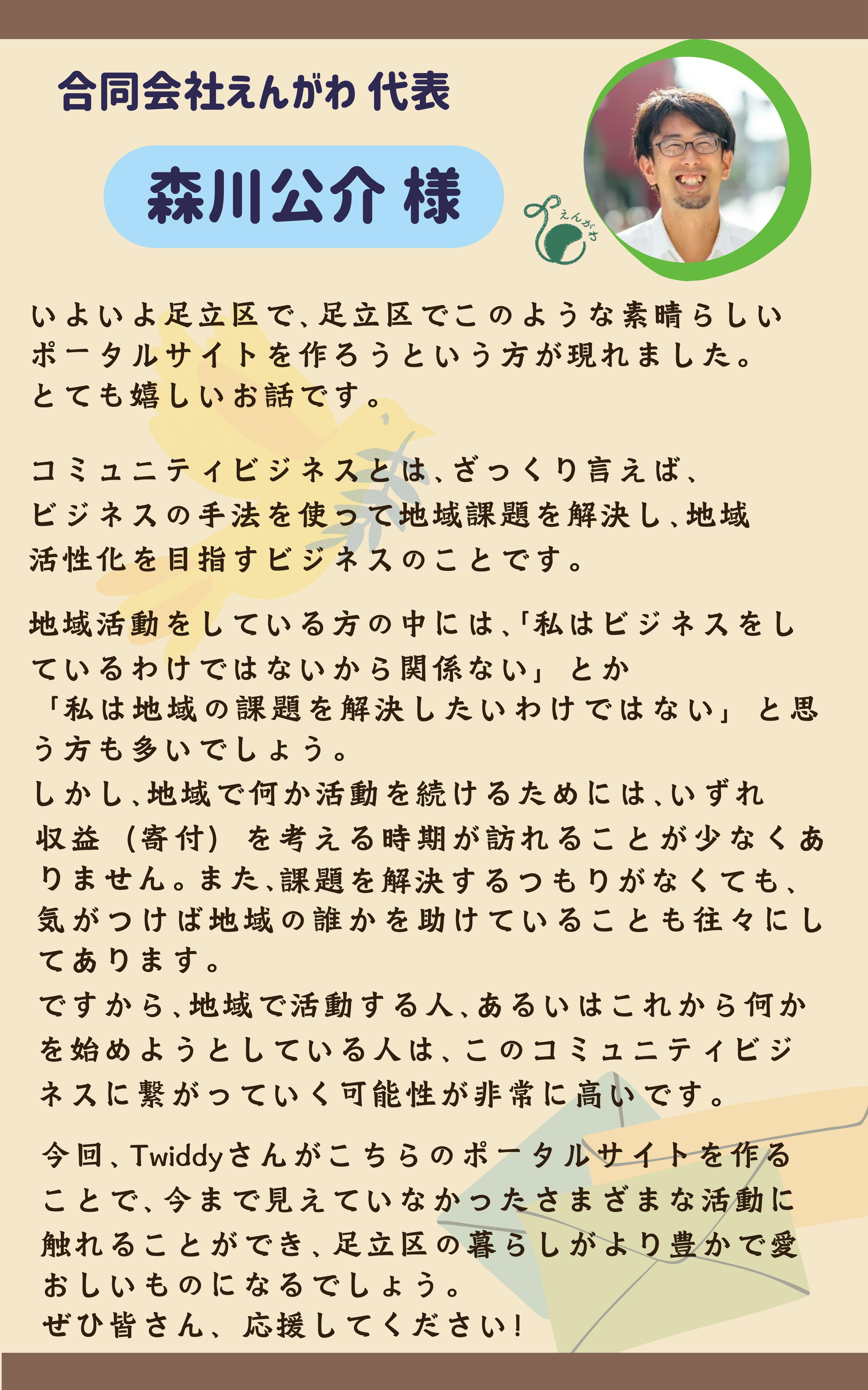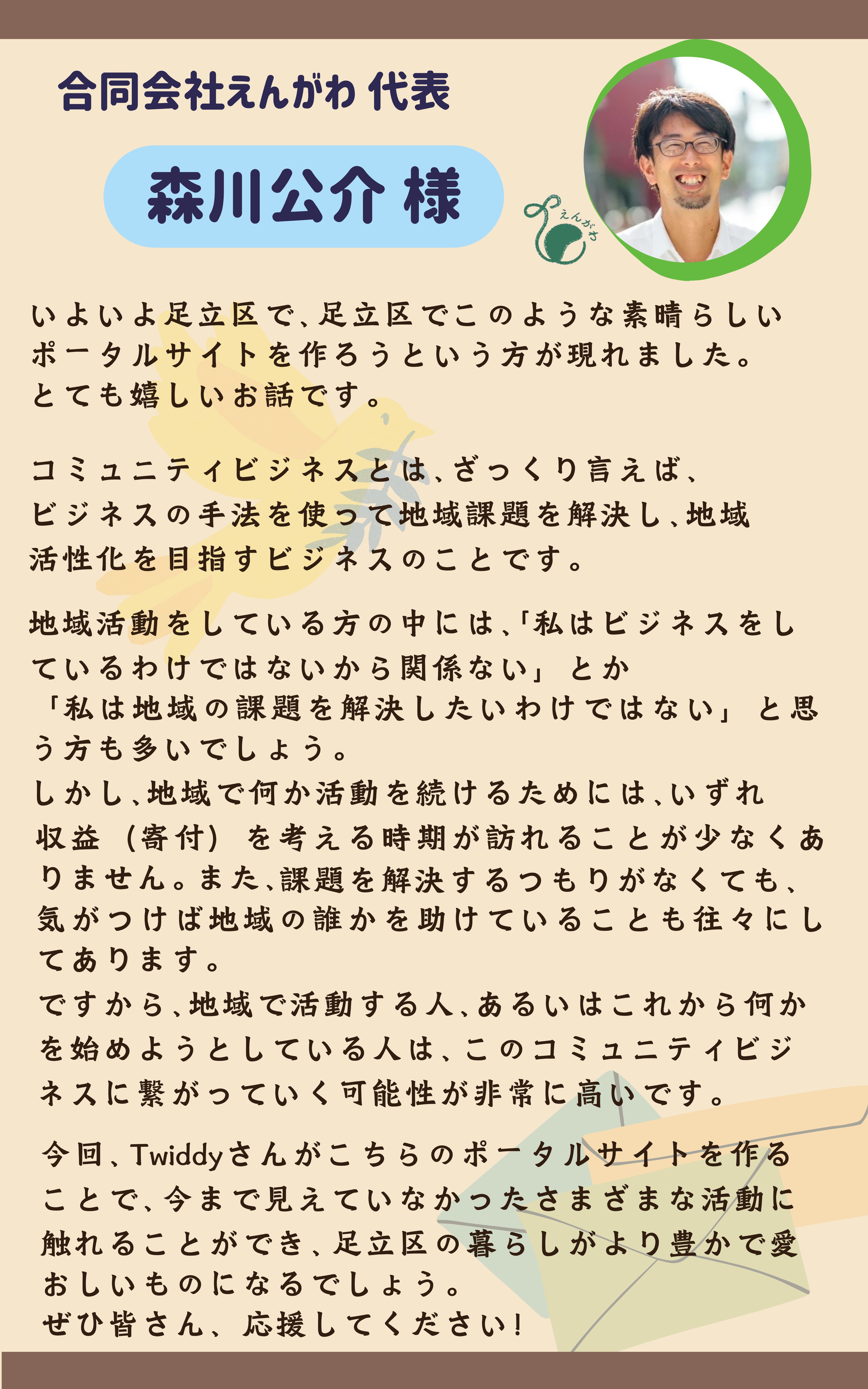 ◆コミュニティビジネスの話を聞いた際、その素晴らしい活動が足立区の住民に十分に知られていないことに気付きました。私たちTwiddyは、映像やウェブ制作のスキルを活かして、これらの活動をもっと広めるためにポータルサイトを制作しようと決意しました。このプロジェクトを通じて、地域の横のつながりを強化し、街全体を活性化させることを目指します!