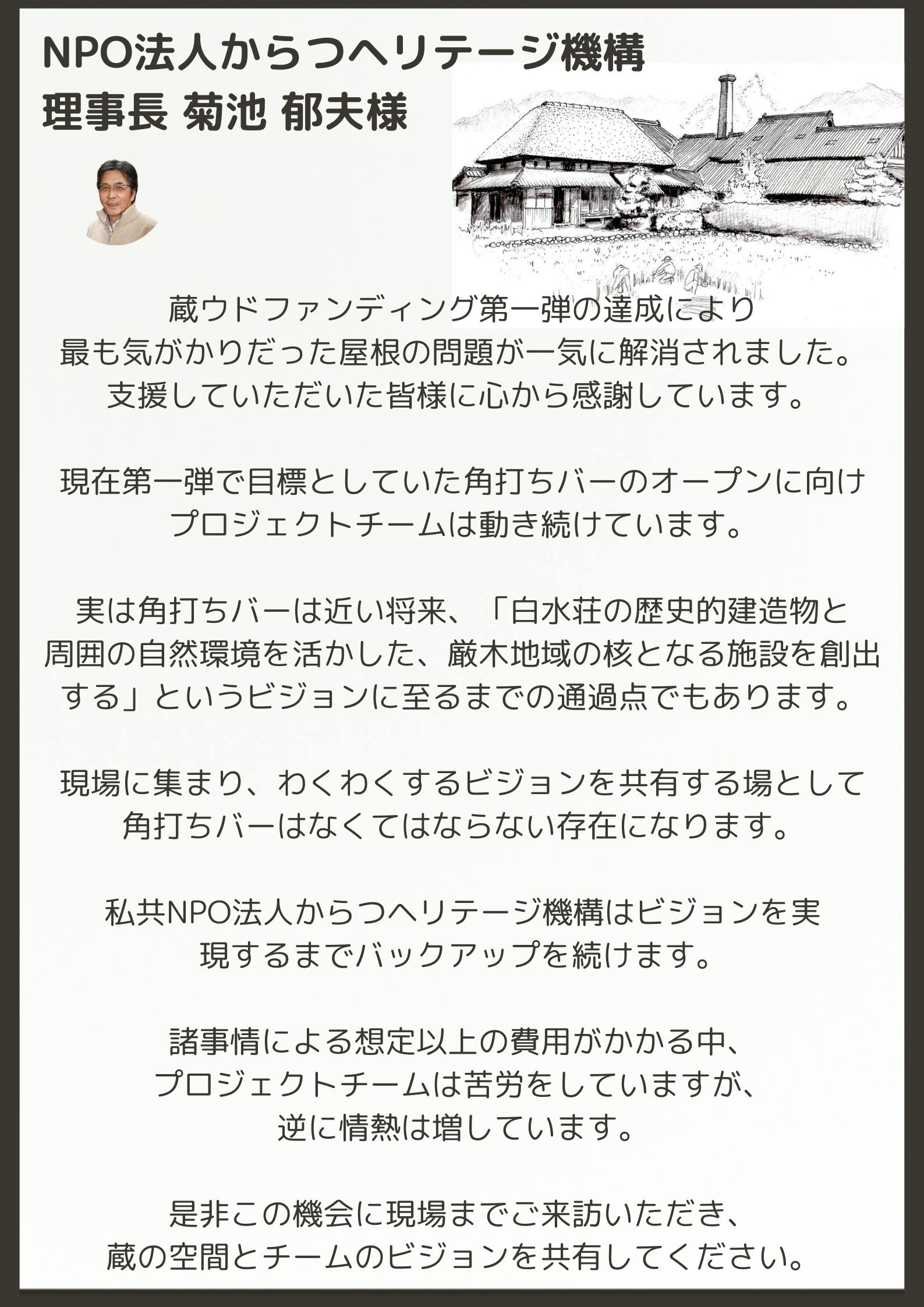 2024/10/23 23:03ご支援を頂きました皆さまへこんばんは。夜分遅くに失礼いたします。白水荘プロジェクト事務局です。改めまして、「酒蔵の雰囲気を活かしたお洒落なBAR空間を創りたい」にご支援を頂きましたことへ御礼を申し上げます。しかしながら、9月末に蔵ウドファンディングを終了してから、ご連絡が滞っておりましたこと、大変に申し訳ございませんでした。そして、ご心配をおかけしましたことを重ねてお詫び申し上げます。皆さまから頂きましたご支援金は、予定通り内装工事の費用に充てさせていただく予定となっております。また、事前に告知させていただきました10月12日(土)はオープンの予定ではありましたが、諸事情がありプレオープンに格下げしてお店を開きました。お陰様で当日は50名を超える方々にご来店いただくことができたのですが、実は、現在はまさかの臨時休業を余儀なくされております。諸事情については、次の投稿をお待ちいただけたらと思うのですが、本日時点正式にオープンする日の目途が立っていない状況です。▼Googleマップにも【臨時休業】と表示させていただいております。https://maps.app.goo.gl/cx656HVJ4HKfuZDX6事務局では一つひとつ正式オープンに向けて、階段を登っていきますので、今一度オープンをお待ちいただけましたら幸いです。一方でご支援いただきました皆さまの中には、返礼品(Tシャツ・お米に該当)をお受け取りになられる方がいらっしゃいますので、ご案内させていただきます。ーーーーーーーーーーーーーーーーーーーーーーーーーーーーーーーーーー【Tシャツ】既にご用意ができておりますので、該当者の方へ個別にご連絡させていただき、受け取り方法を調整できればと考えております。【厳木産の新米】今月中に仕入れの調整が整う予定ですので、11月初旬に発送、受け取りとなる予定です。お待たせしてしまい大変恐縮ですが、11月に入りましてから改めてご連絡させて頂きます。ーーーーーーーーーーーーーーーーーーーーーーーーーーーーーーーーーー進捗状況や今後については、こちらの活動報告に合わせて、インスタグラム・Facebookで発信させていただきますので、情報に漏れがないよう、フォローを頂けますと嬉しいです。インスタグラムFacebook今週末に、次の投稿(諸事情の内容)をお送りできればと思っています。お騒がせいたしますが、諦めずに必ず前に進んでいきますので、引き続きよろしくお願いいたします。白水荘プロジェクト事務局 もっと見る
