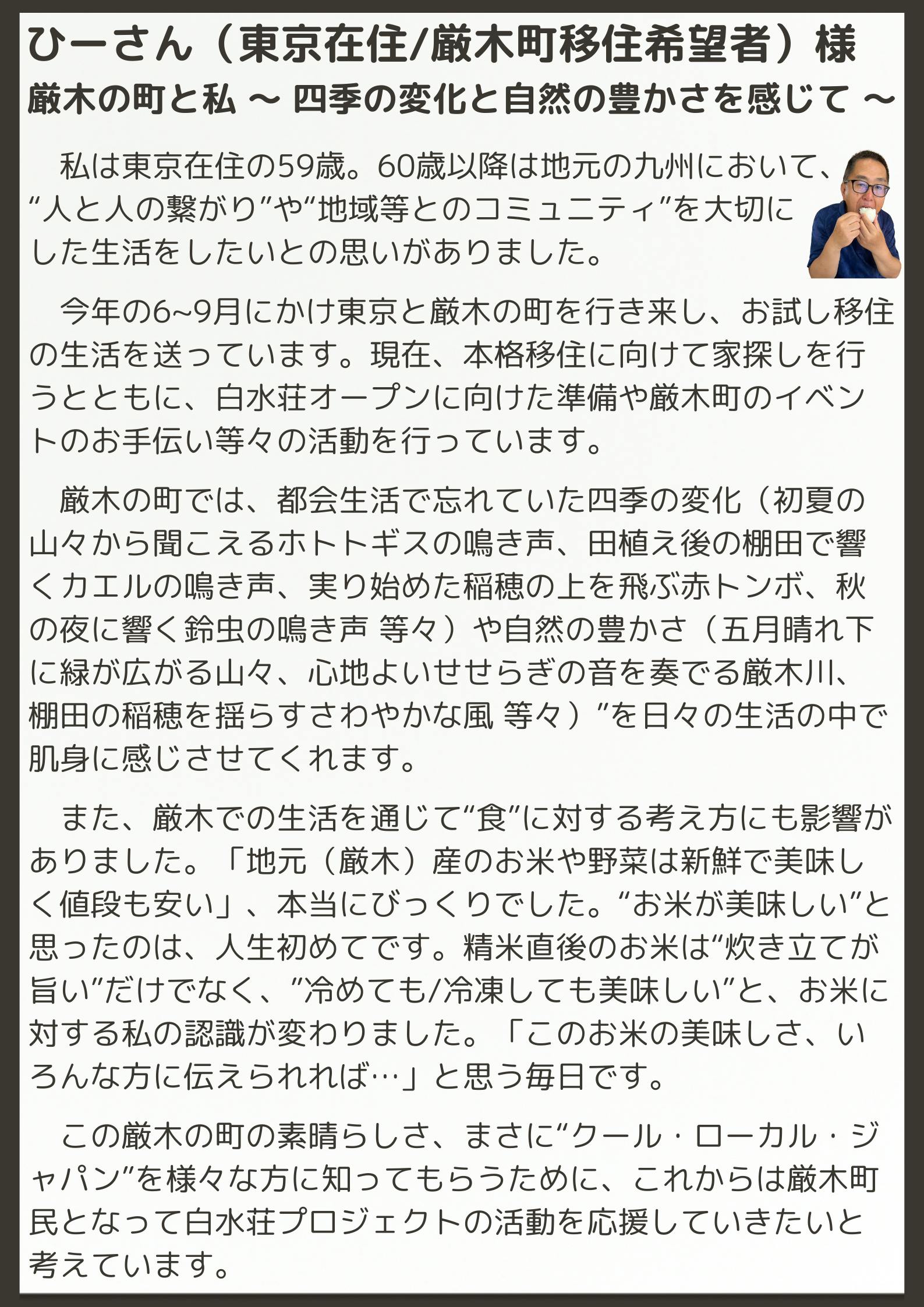 「白水荘(はくすいそう)プロジェクト」代表 有馬 / リーダー 横道です。