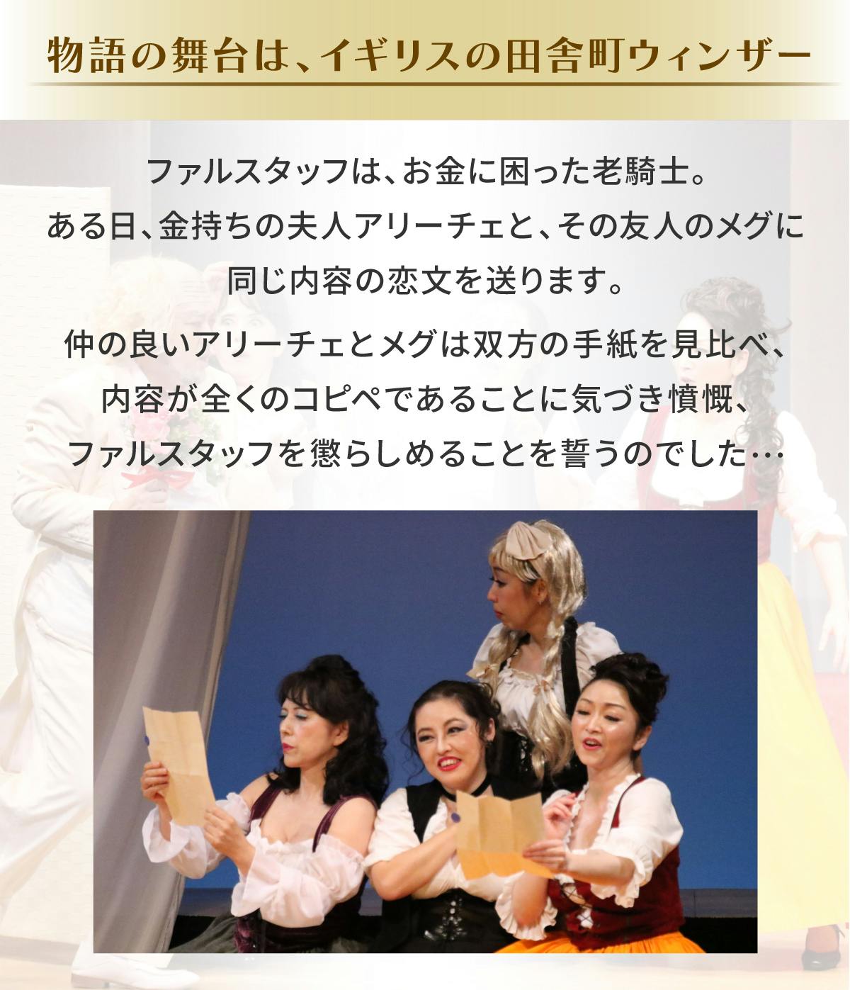 大食いで大酒飲みで好色で太っちょの老騎士ファルスタッフとその恋のターゲットである美しい人妻たち、その友人と家族、自身の手下たちの騒動を描いた笑いの物語です。