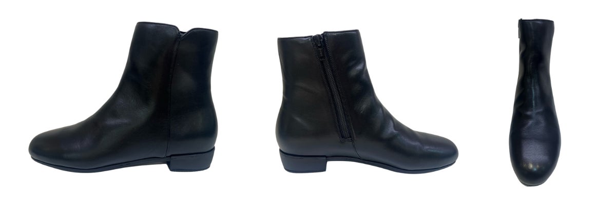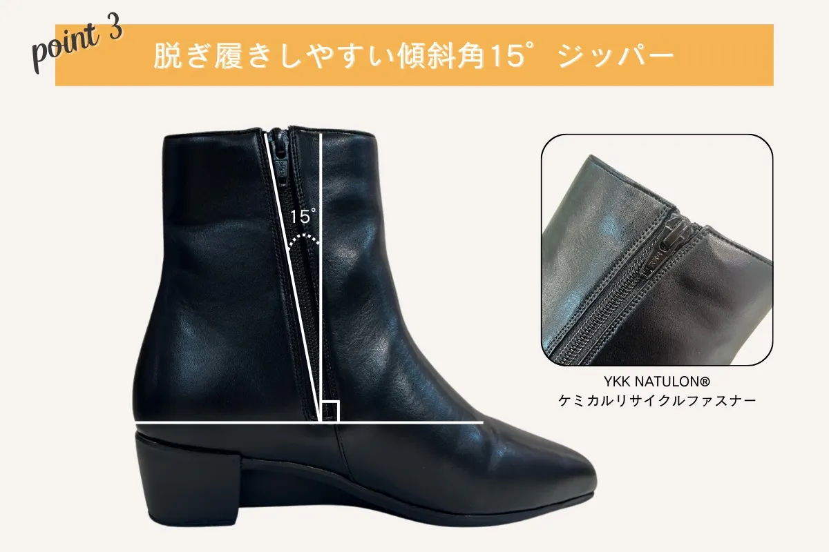 履くときの足の角度に注目して、ジッパーのつけ方も一工夫。