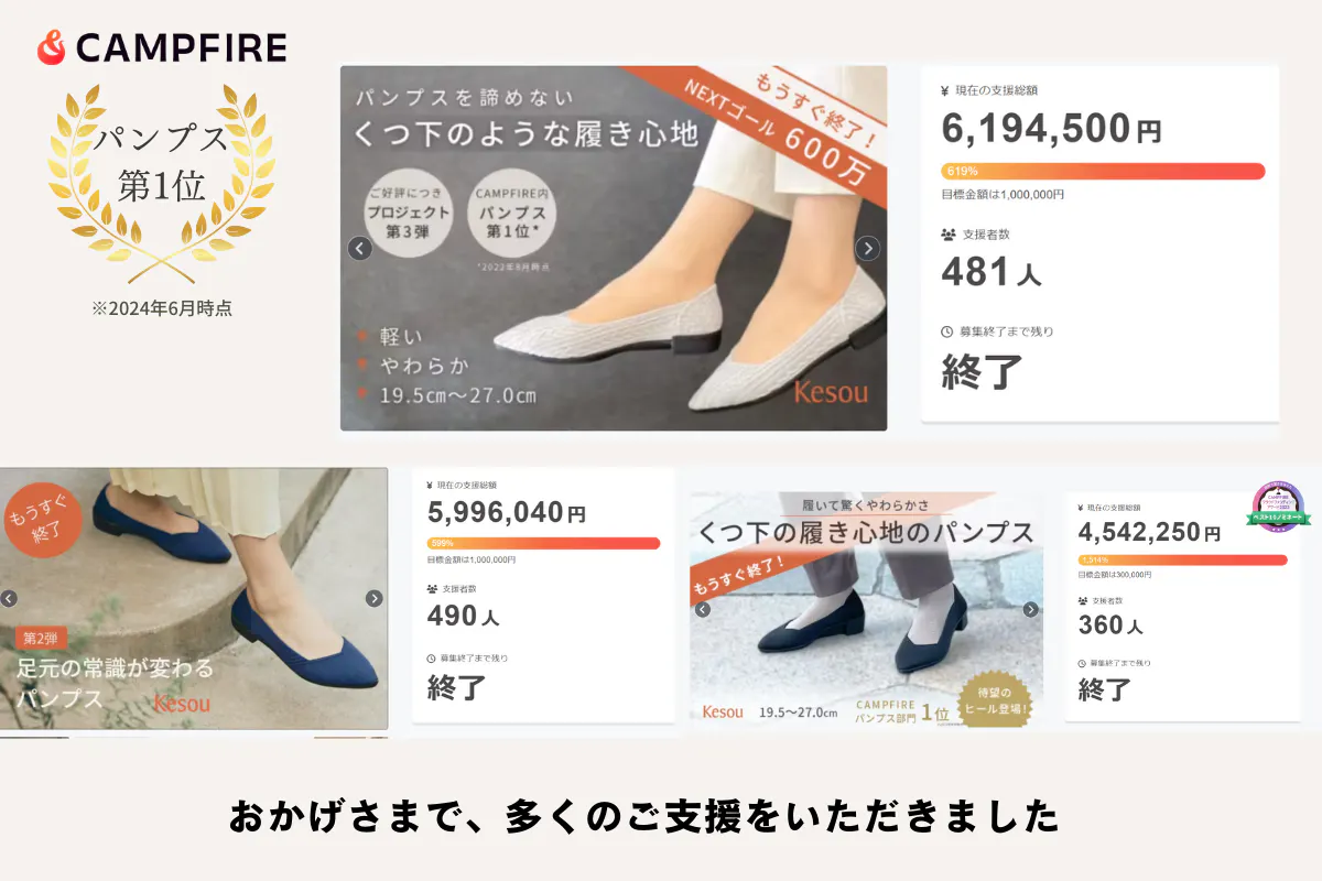 2024/09/26 16:30こんにちは、Kesouです。早いもので、残り3日となりました!おかげさまで目標金額500%達成いたしました。多くの方にご支援いただき、スタッフ一同心より感謝申し上げます。まだ迷っていらっしゃるという方、返品・交換も無料ですので、ぜひお気軽にお試しいただけたらうれしいです。※返品・交換は、室内でのお試し履きのみの方・お届けより14日間承ります。プロジェクトの終了まで、少しでもこの温かい輪が広がりますように。共感いただけるポイントがございましたら、SNS等ご家族・ご友人・知人の方におすすめいただけると嬉しいです。ぜひ最後まで応援よろしくお願いいたします!Kesou もっと見る