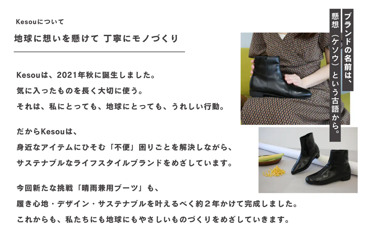 履き心地・飽きのこないシンプルなデザイン、そしてサステナブルを両立させた「Kesou晴雨兼用ブーツ」