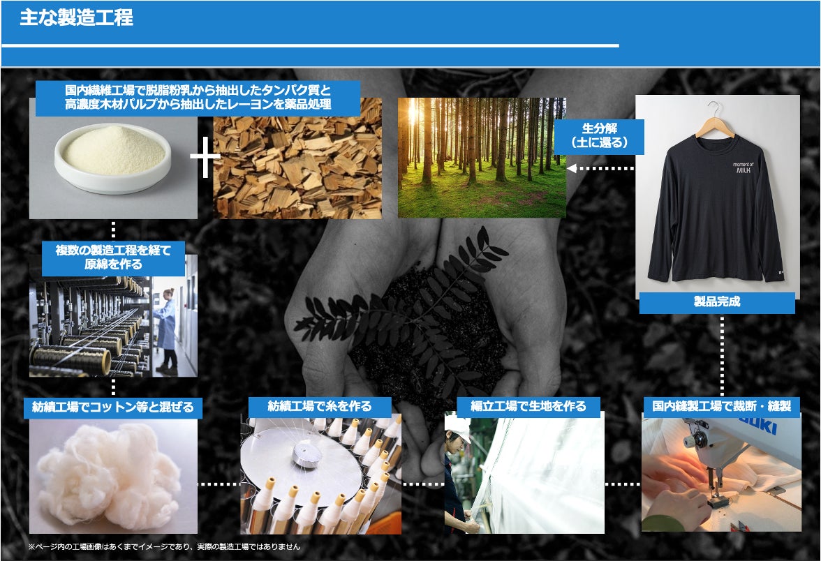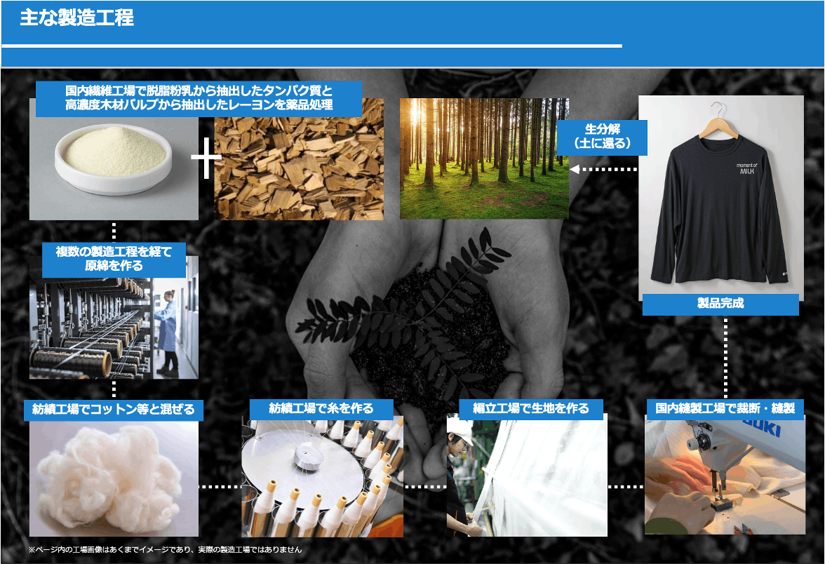 「高純度木材パルプ由来のレーヨンと国産脱脂粉乳由来のタンパク質を練り込んで、半合成繊維として活用する」ものとなります。