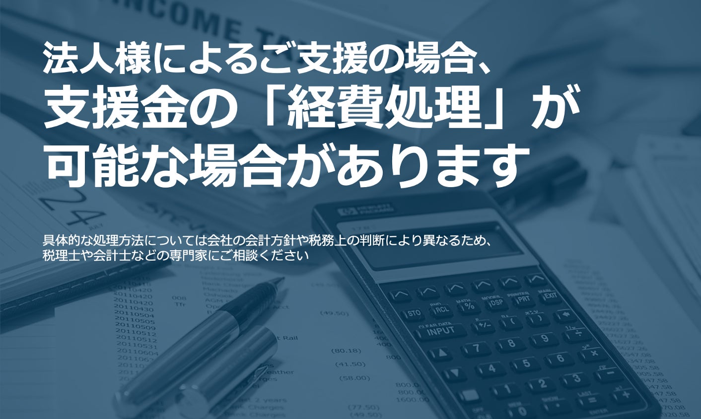 法人様によるご支援をいただいた場合、支援金の経費計上が可能な場合があります。