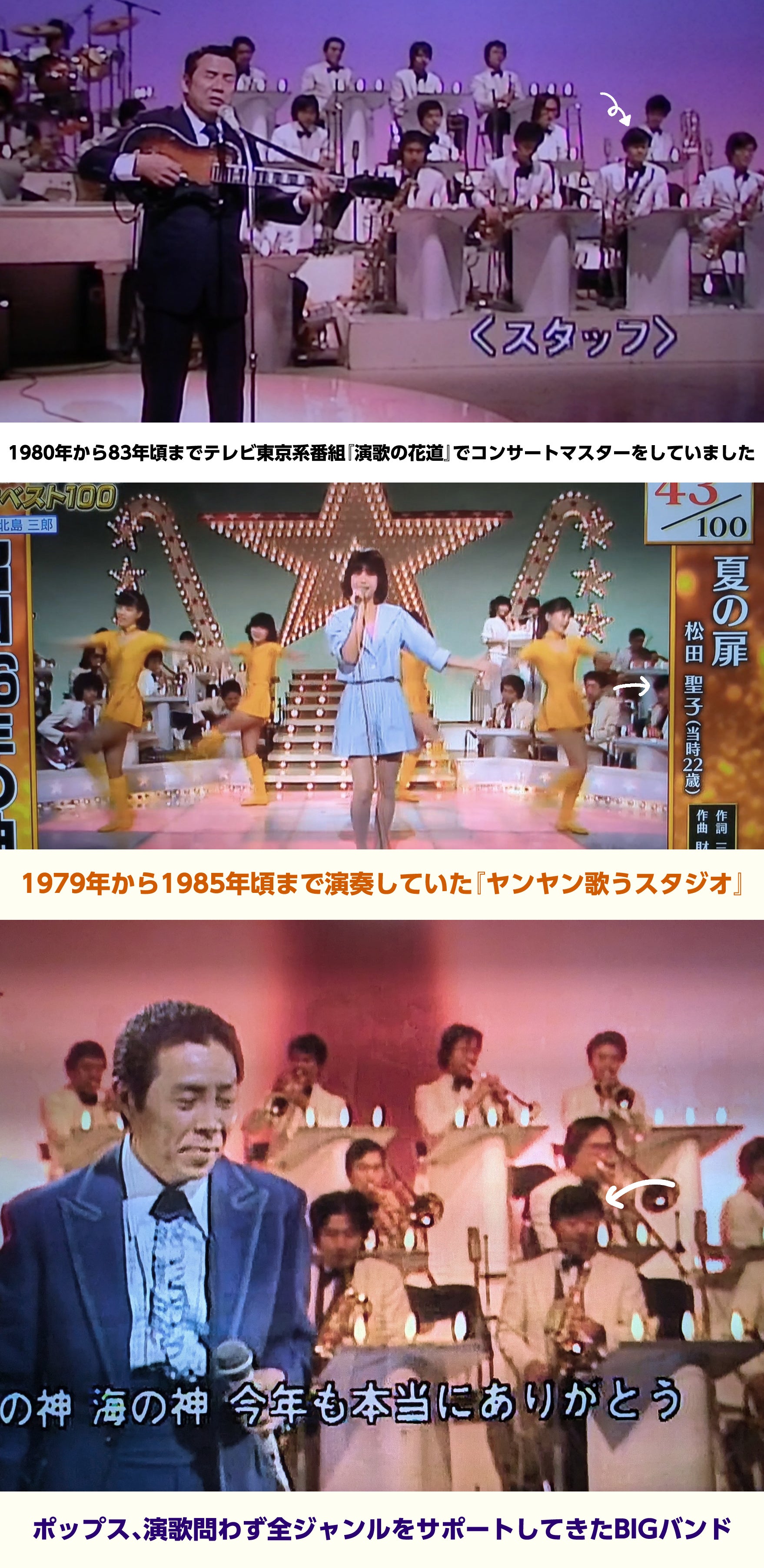 今でこそミュージシャンはパソコンや電子機器を巧みに使い、多種多様な音を生み出すことができますが、かつての歌謡界はビッグバンド無しで音楽番組を成立させることは不可能でした。