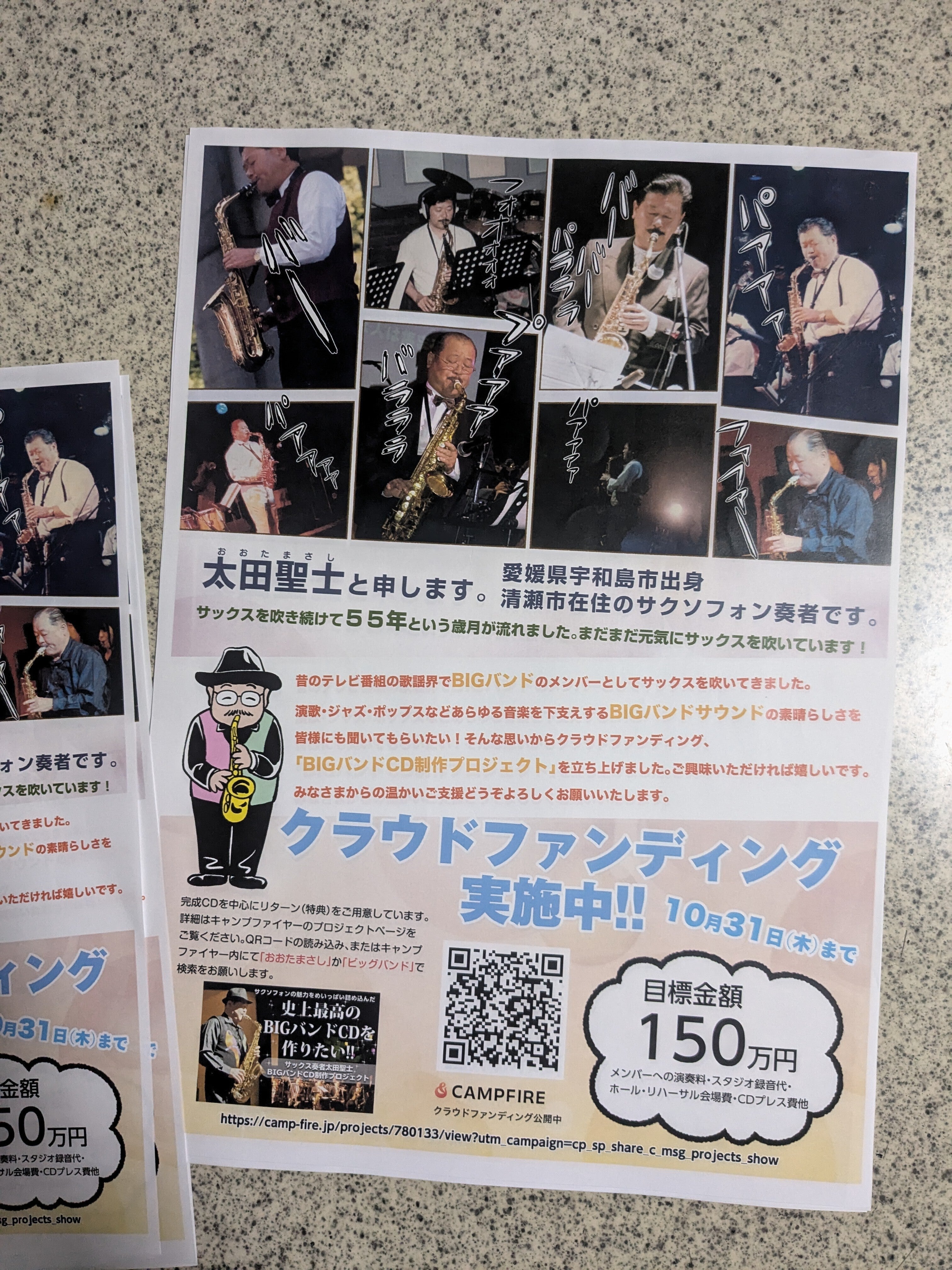 こういった宣伝ポスターやチラシはどうしても必要になってきますね。息子が作ってくれました。特に私たち高齢の世代はSNSを四六時中見ているわけではありませんから、活動をお知らせするには紙面を使った直接のコンタクトが必要ですね。具体的な金額が掲載されているのでこの部分で少し引かれてしまうこともありますが、そこは正面からお伝えしないといけません。頑張らないと。清瀬市の方や故郷愛媛宇和島の方々にとても協力していただいています!本当に感謝しています!YouTubeショート演奏The Dream