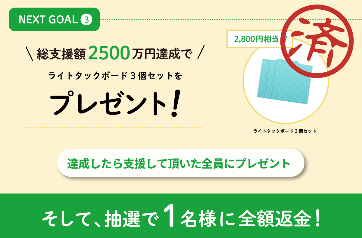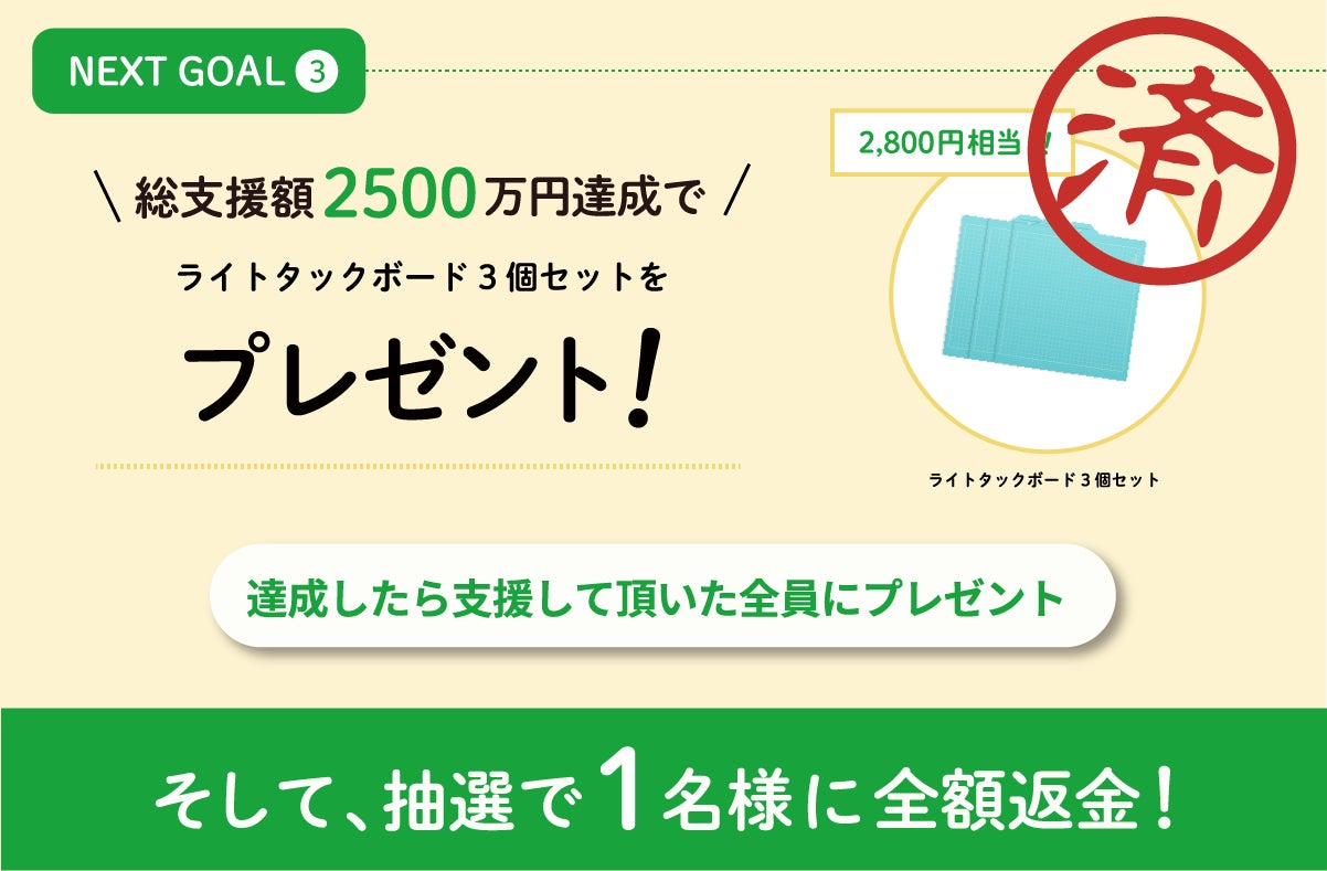 ネクストゴール2,500万円を達成しましたので、ご支援者さま全員に、さらにライトタックボードをプレゼントいたします!!!!