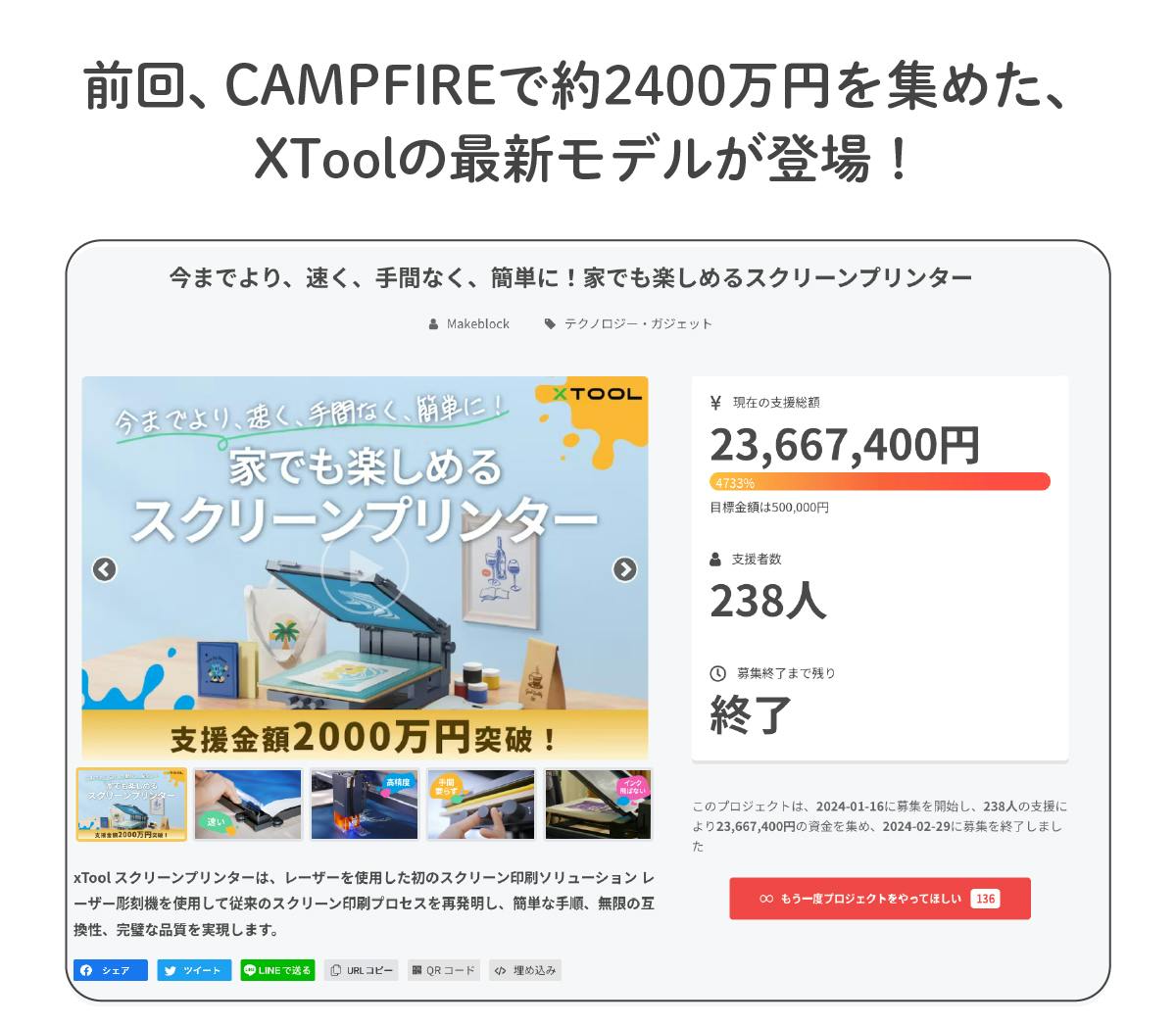 2021年10月にはGREEN FUNDINGにてxTool D1のプロジェクトを実施し、507名の方々から5,700万円のご支援を頂きました。製品の配送やアフターサポート等、一般流通している製品と変わらないサービスを支援者の皆様に提供しております。
