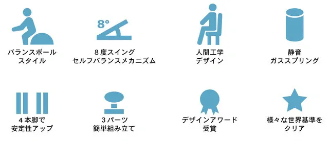 A1.その秘密はセルフバランスメカニズム。前後左右どこからでも8度傾くと、センターに自然に戻る動きを繰り返し行い、滑らかな揺れとなります。揺れがセンターに戻る際に、お腹に力が入るため、デスクワークをしながら体幹をトレーニングできます。また、心地良い揺れに意識を向けることで適度な気分転換となり、仕事の効率もアップするかも。