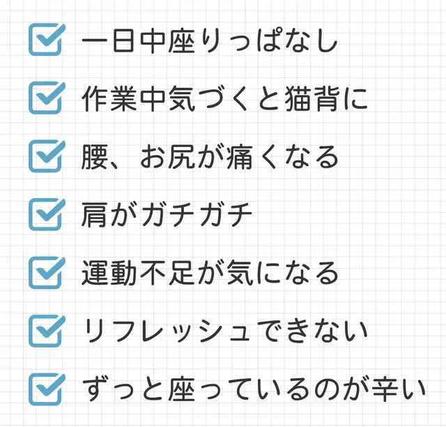 デスクワークで1日座りっぱなしの方、ずっと座っているのが辛い方にオススメです。