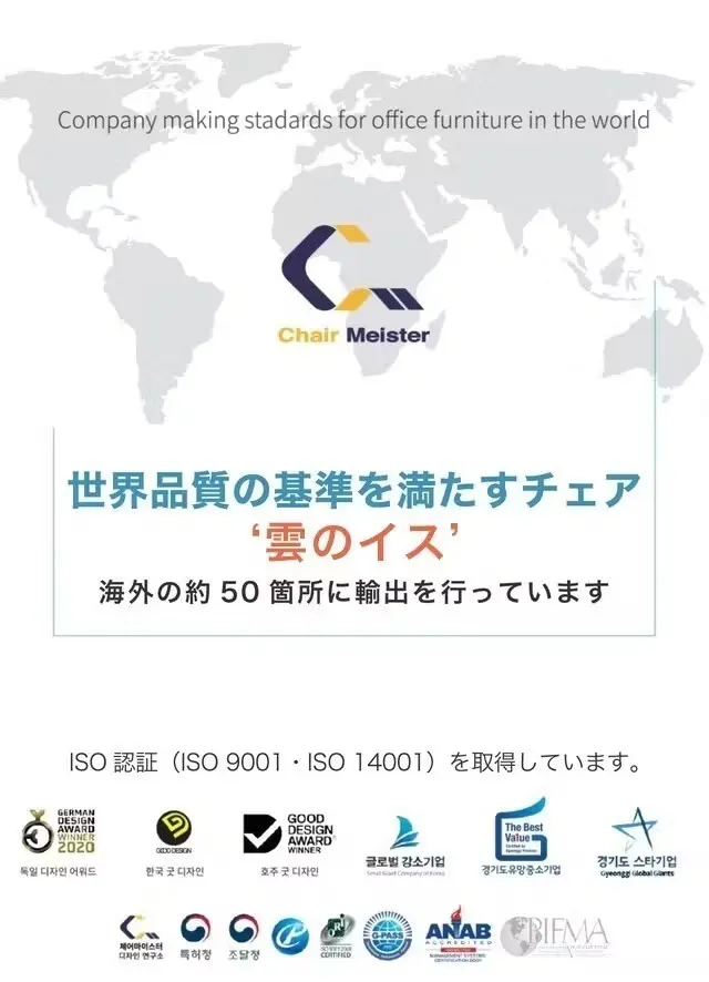 チェアマイスターは海外約50箇所に輸出を行っている椅子専用のメーカーです。人間工学に基づいたデザインにこだわり、お客様が座って快適な椅子を作るために絶えず研究と努力と続けてきました。
