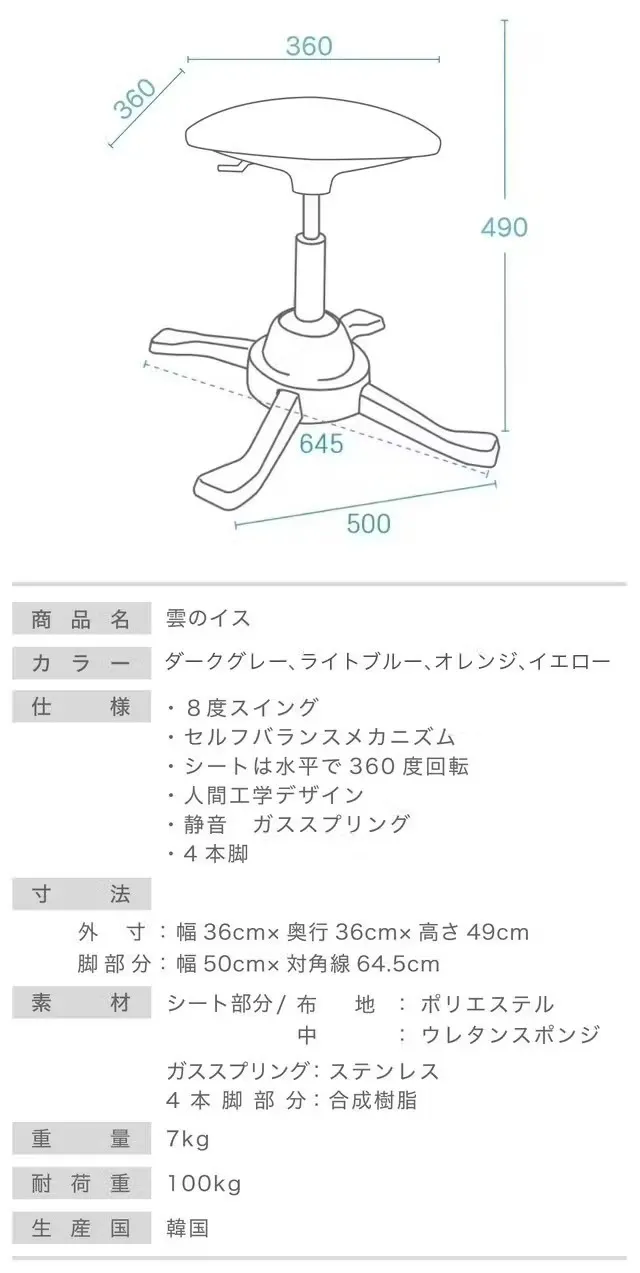 A3.その秘密はバランスボールスタイル。雲のイスはバランスボールに座っているように自然と正しい姿勢に整えることができ、背もたれがない状態でも、腰をそっと支え姿勢を安定させます。無理せず自然で良い姿勢をキープします。バランスボールのデメリットを改善し、コンパクトでお洒落なデザインにしたのが「雲のイス」なのです。
