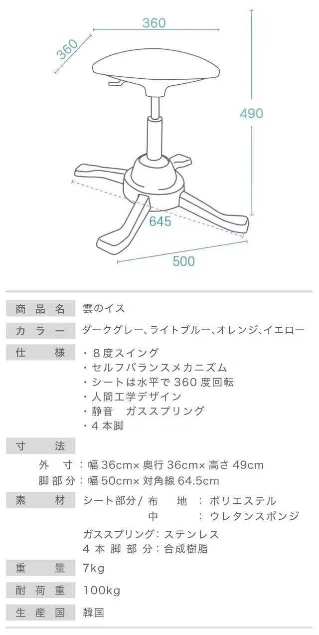 A3.その秘密はバランスボールスタイル。雲のイスはバランスボールに座っているように自然と正しい姿勢に整えることができ、背もたれがない状態でも、腰をそっと支え姿勢を安定させます。無理せず自然で良い姿勢をキープします。バランスボールのデメリットを改善し、コンパクトでお洒落なデザインにしたのが「雲のイス」なのです。