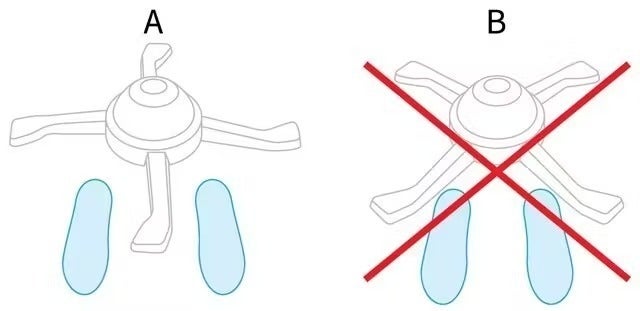 A9.1本の脚を挟んで、両足を床につけた状態で使用すると、倒れる事故を防ぐことができます。サドルチェアに座るときは、足の位置を図Aのように使用することをお勧めします。製品仕様の下にある使用上のご注意のA、Bの画像をご確認下さい。