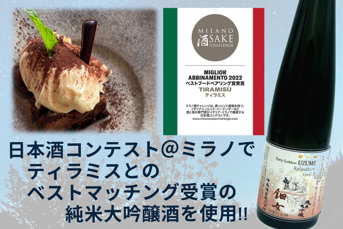 ミラノの日本酒コンテストでティラミスとのベストマッチングに選ばれた 新感覚の日本酒 UZUME Relaxation Lv3 純米大吟醸を使用。鈴鹿山麓の伏流水で育った低環境負荷の契約栽培米で醸した、水の恵みをたっぷり含んだ日本酒です。