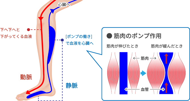 通常、ふくらはぎの筋肉がポンプとなって、血液を押し上げています。こうしたことから、ふくらはぎは「第2の心臓」と言われているのです。