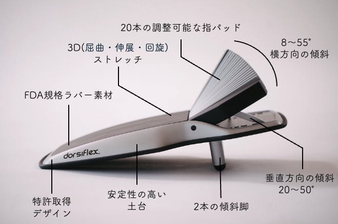 しかし、DorsiFLEX は、20 本の調整可能な「指」で作られており、横方向のストレッチを追加。