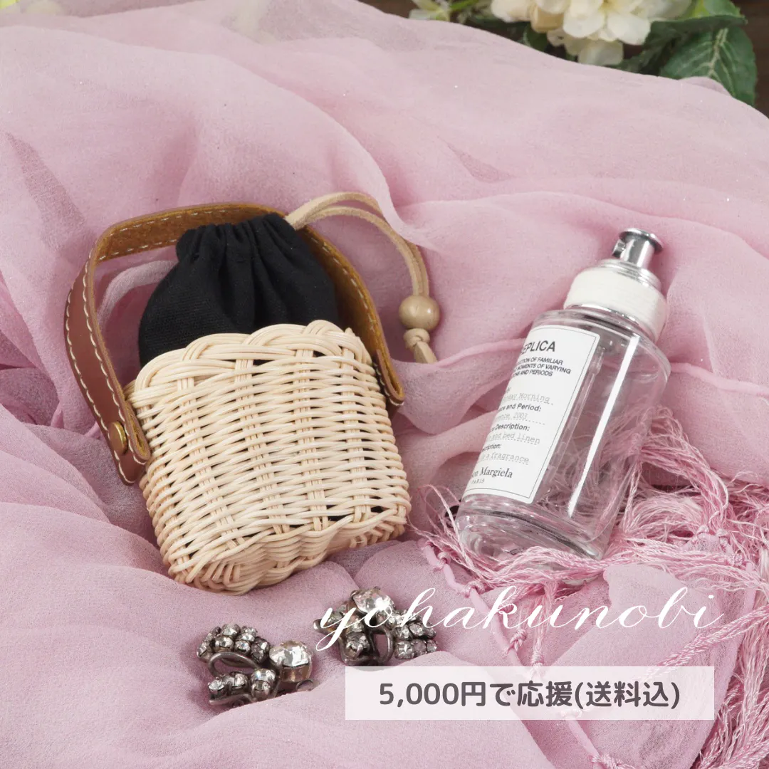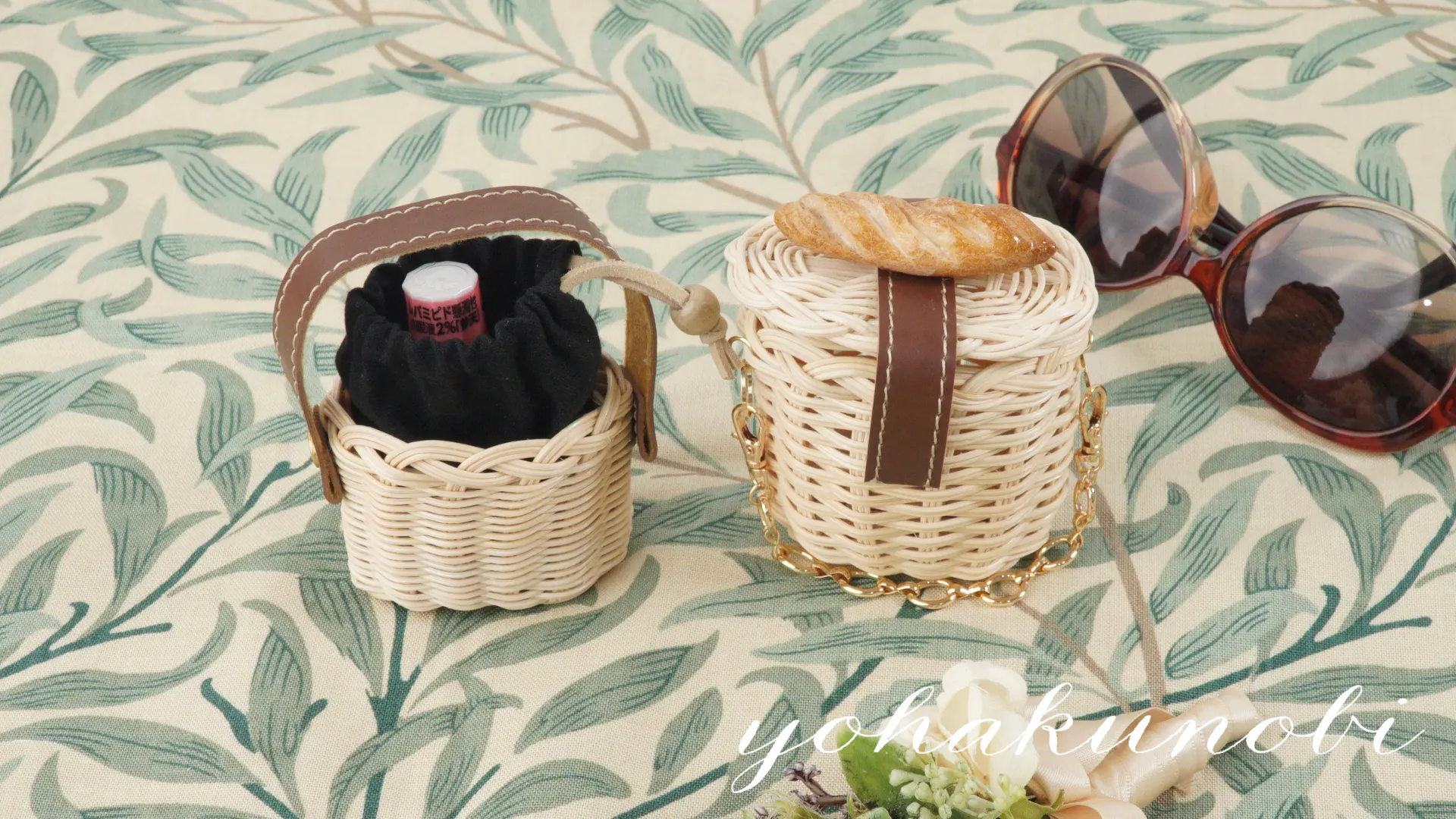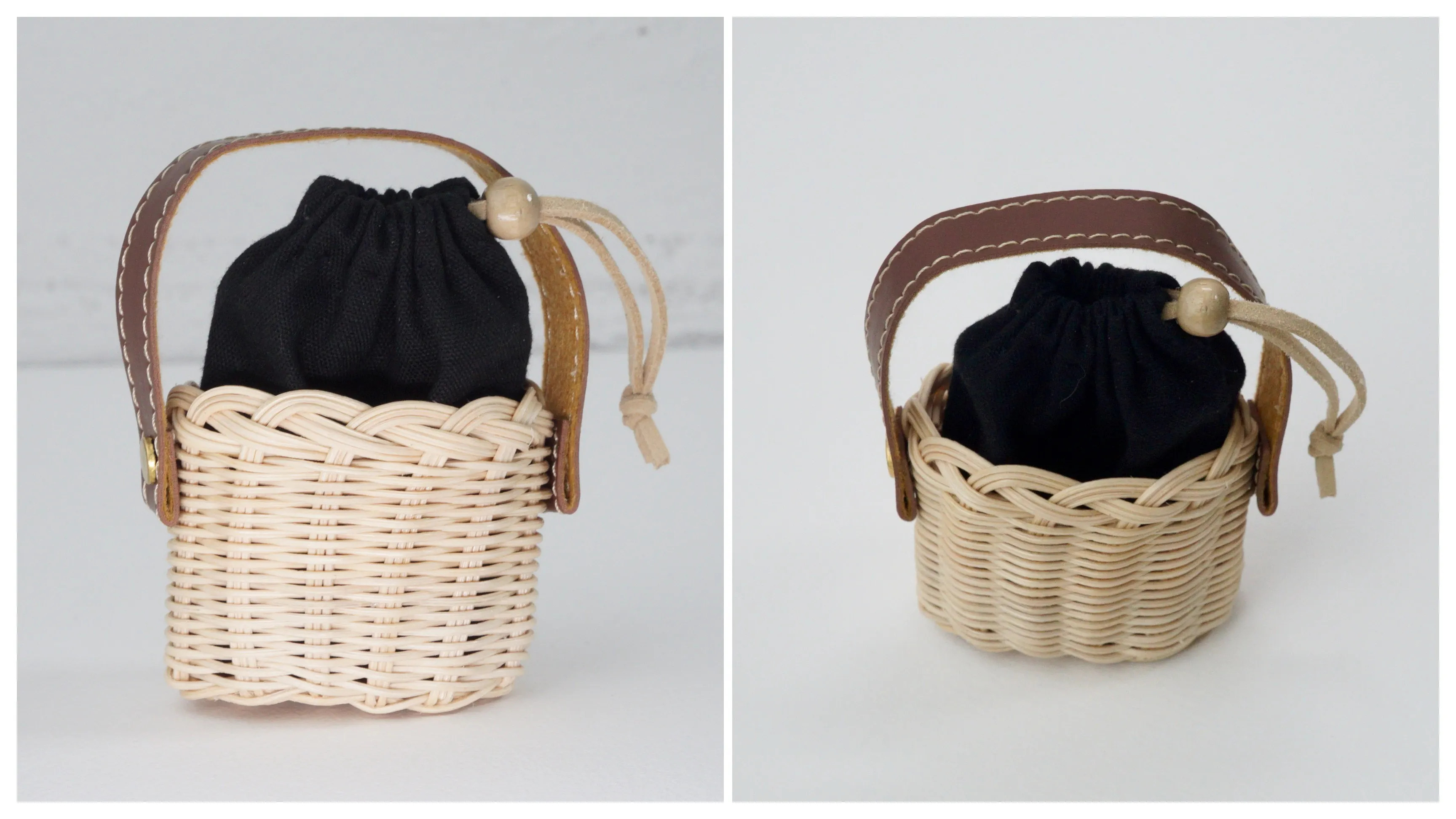 こちらはカゴの中に巾着が入っているタイプです。最もシンプルな形なので、どんな人でも合わせやすいですね。