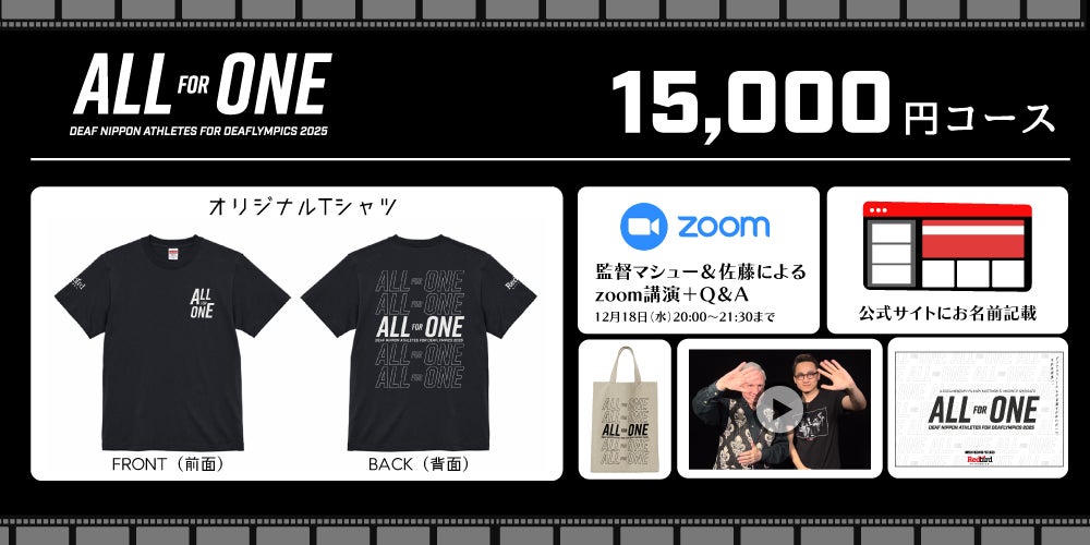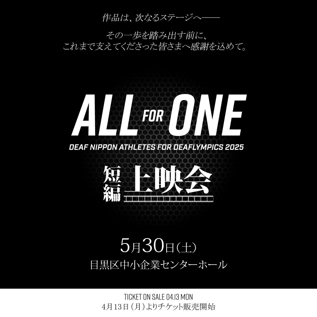 2026/04/11 11:29デフアスリートに密着したドキュメンタリー短編映画『ALL FOR ONE(オール・フォー・ワン)』上映会を開催いたします。本作は、日本のろうアスリートたちが2025年に東京で開催されるデフリンピックに挑む姿を追った作品です。ろう当事者を中心とした制作チームにより制作され、5名のデフアスリートに密着。それぞれの競技、日常、そして挑戦の過程を丁寧に描いています。聴者と対等に、自信と強みを持って活躍する彼らの姿から、新たな気づきや可能性を感じていただける内容となっております。上映に加え、当日は以下のプログラムをご用意しております。・監督とデフアスリートによるトークショー・デフアスリートによる講演・写真撮影・サイン会 作品の世界観をより深く体感いただける機会となっております。■日時2026年5月30日(土)11:30〜16:00■スケジュール【PART1】11:30〜12:00 上映12:00〜12:45 トークショー(監督 × デフアスリート)————— 休憩・販売 ————— 【PART2】13:30〜15:00 デフアスリート講演15:00〜15:15 監督メッセージ15:15〜16:00 写真撮影・サイン会■会場目黒区中小企業センターホール■チケット料金(自由席)前売券:2,500円当日券:3,000円2026年4月13日(月)12:00より、チケット販売を開始いたします。前売券は数に限りがございますので、ご希望の方はお早めにお申し込みください。皆さまのご来場を、心よりお待ちしております。 もっと見る
