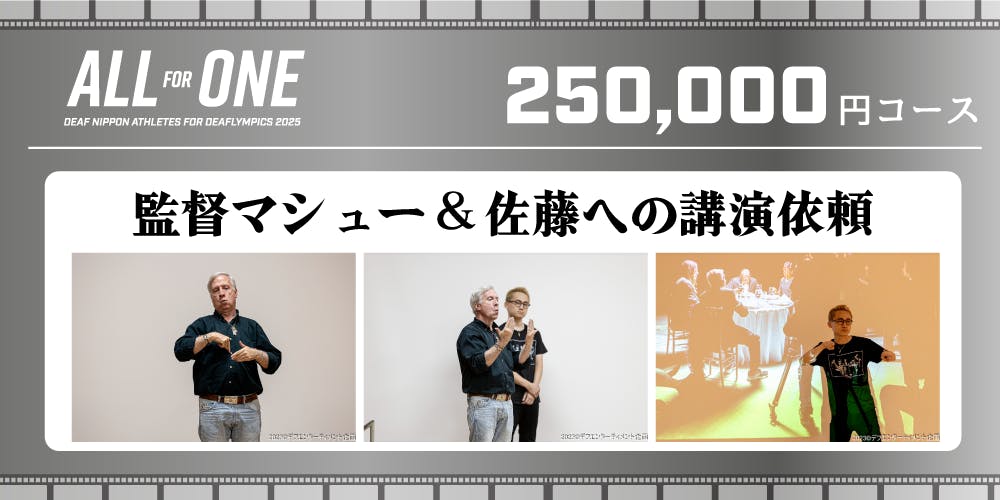 デフアスリートを撮る私たちにも同じ目標があります。映画祭や映画業界などで、私たちの実力を世界に認められたい。 映画業界で活躍しているろうアクターだけではなく、カメラの後ろにいるろうフィルムメーカー(映画制作者)が作り上げるストーリーテリングを世界に体験してもらうのが私たちのミッションです。