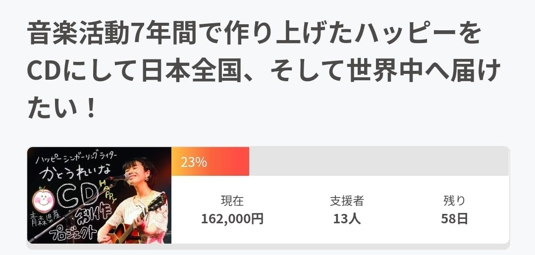 おつかれさまです。夜中に失礼します!クラファン挑戦2日目【23%】達成!13枚のハッピーに変わっています!うれしくってありがたい!