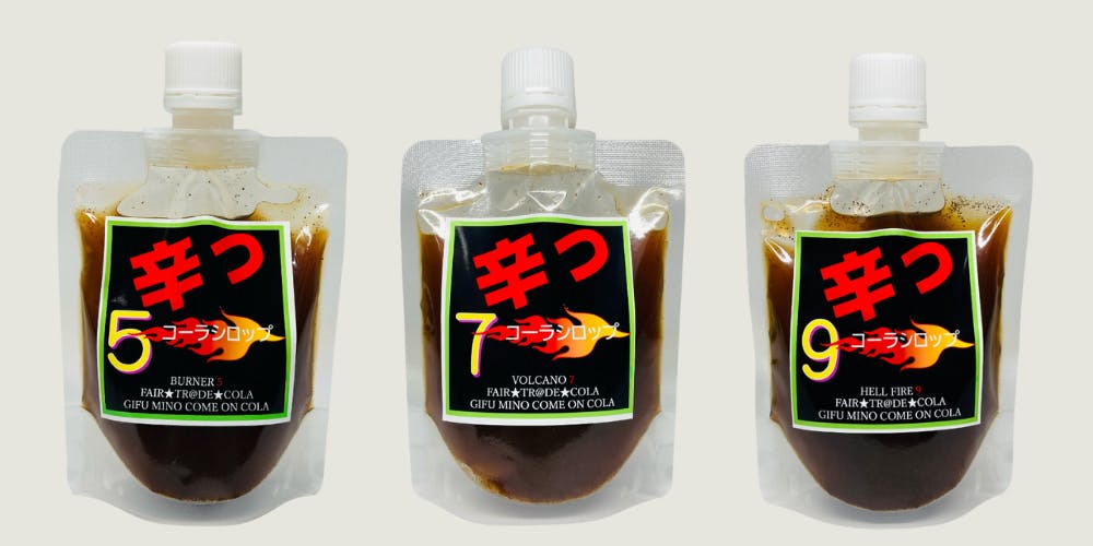 ベースとなる1辛の辛っコーラはマダガスカル産の高級バニラビーンズをはじめ17種の天然スパイスとミネラル豊富なキビ糖、瀬戸内海をはじめとする国産レモンと高知県の生姜など厳選素材を飛彈川水系の磨かれた水を使い、丁寧に手作りで作っております。