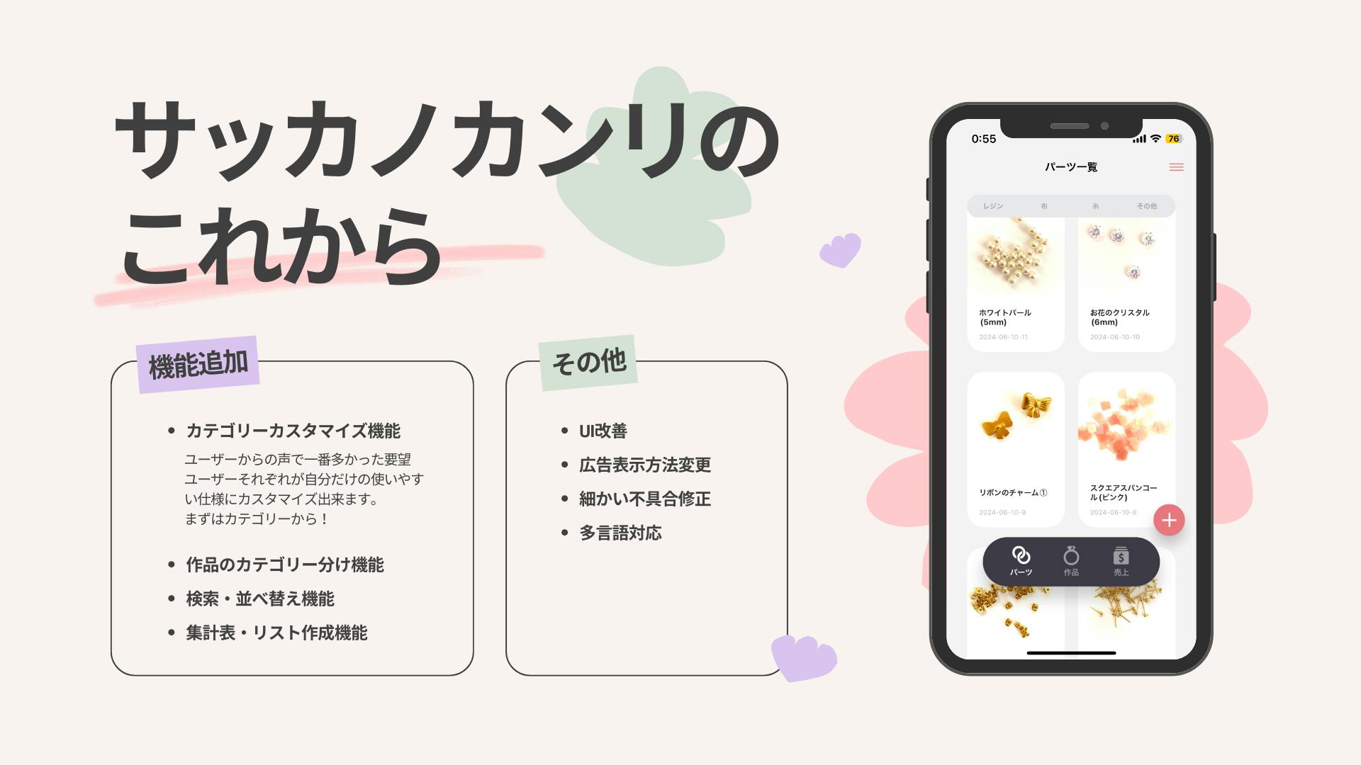 アプリユーザーのみなさまの声を反映したアップデートを行い、ハンドメイド作家さんにとってさらに便利な一元管理ツールへと成長させていきたいと考えています。