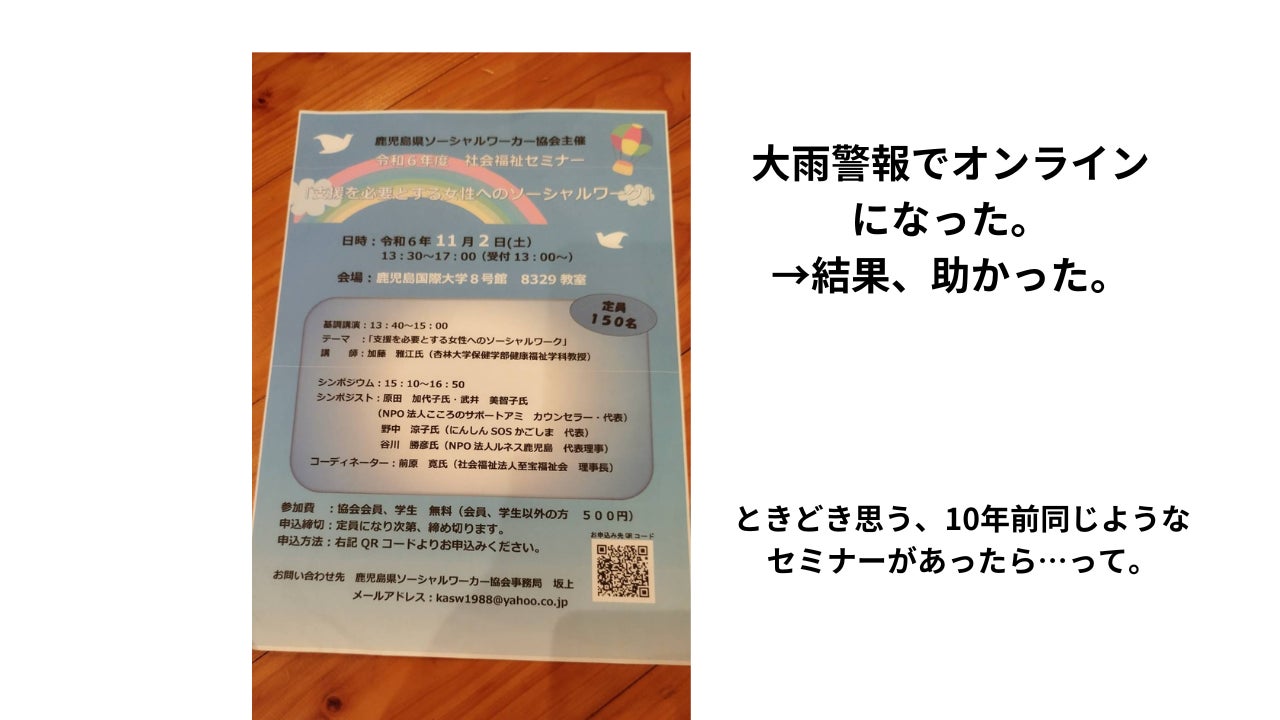 2024年4月から、困難な問題を抱える女性への支援に関する法律が施行されました。これの設立背景とかを勉強したかったから、このセミナーを受講しました。