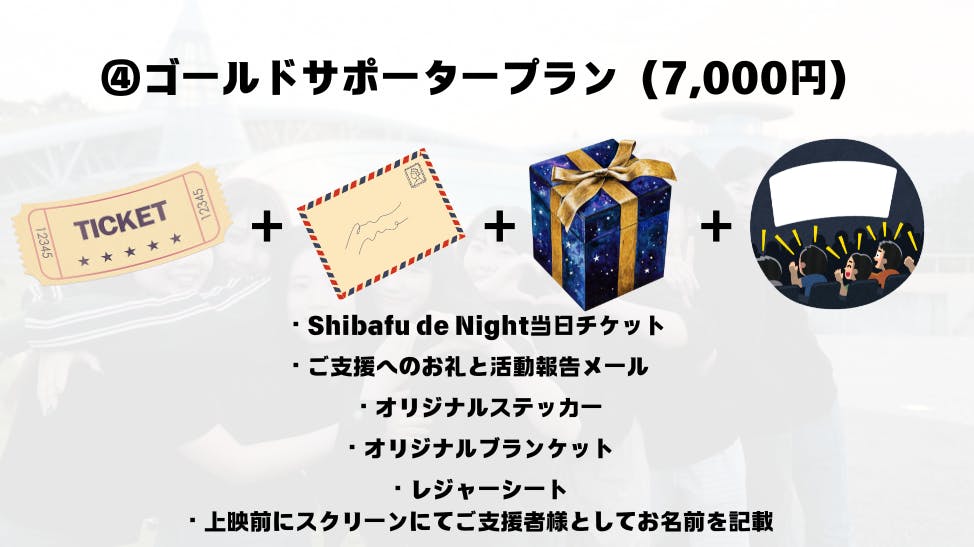 Shibafu de Night 2024 は入場無料で開催するものです。入場料を徴収する場合、映画の作品自体のレンタル費が膨大に膨れ上がってしまい、学生主体で野外映画プロジェクトを運営することが困難になってしまいます。非営利で本プロジェクトを運営するため、皆様からのお力添えを頂きたく存じます。どうぞよろしくお願い致します。費用が目標より多く集まった場合、上映空間をより良くするための会場演出・装飾費用に使わさせていただきます。