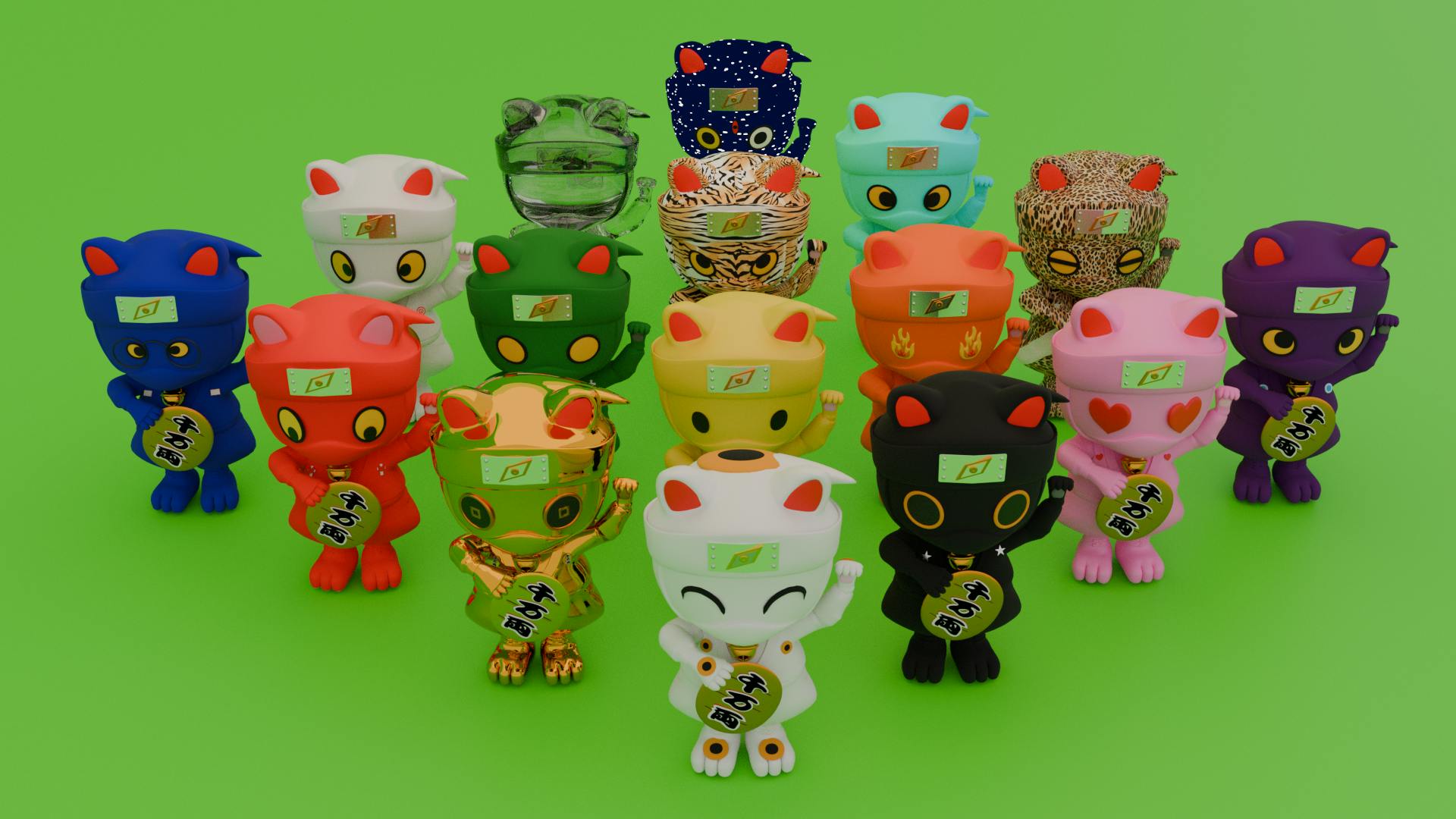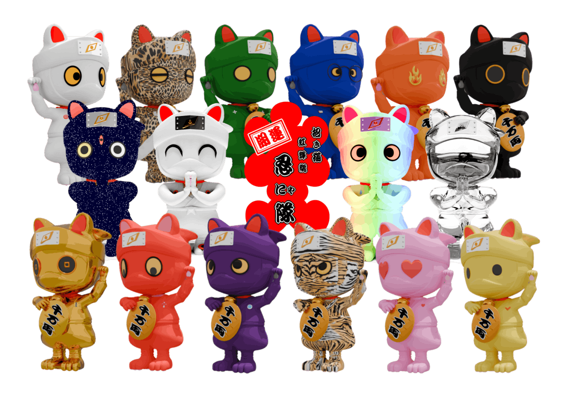 これらのキャラクターは、招き猫の幸運を招く特徴と忍者の神秘的で機敏なイメージを組み合わせています。また、伝統的な招き猫に忍者の要素を加え、最先端技術のAR(拡張現実)を取り入れたユニークなAR3Dフィギュアとして、幸運や成功を象徴するキャラクターとして、日本の文化的要素を現代的にアレンジし、伝統と現代のポップカルチャーを融合させた創造的な表現を試みました。