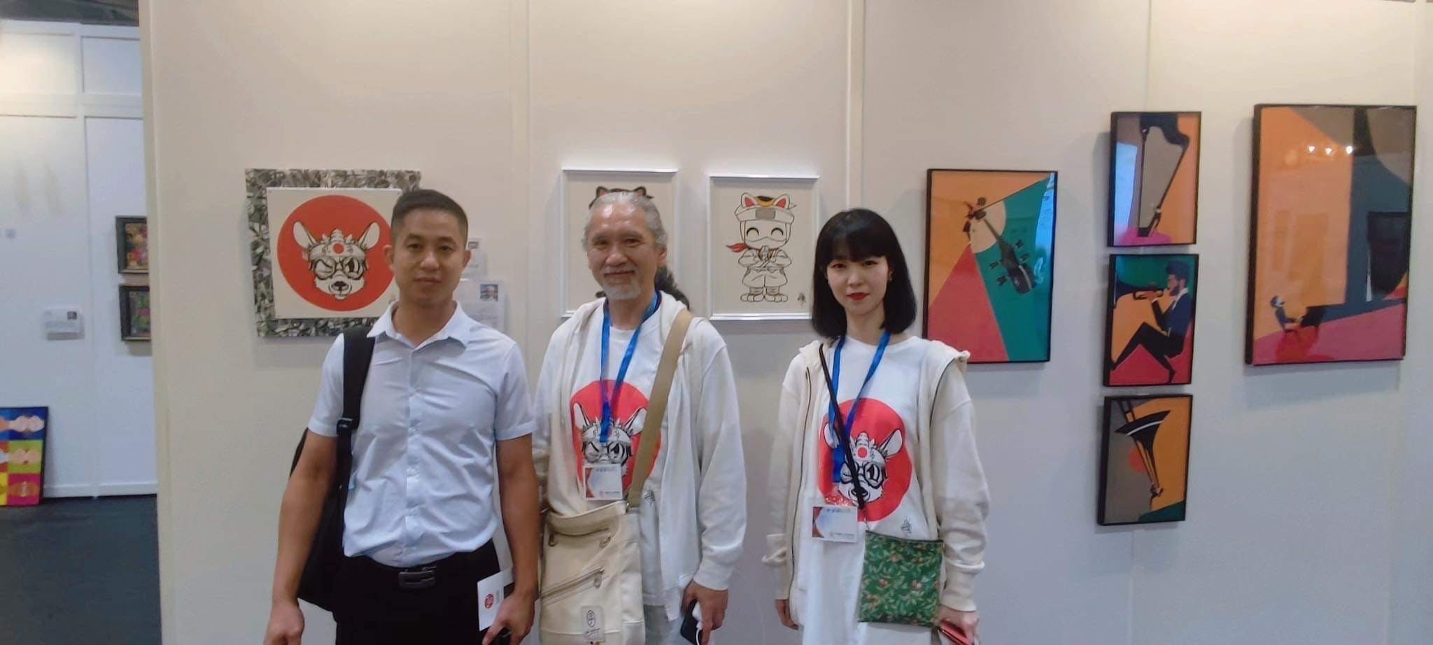 香港国際ARアートフェアの展示ブースにて「広州国際公共芸術博覧会2024」バイヤーズグループの何氏と(左)