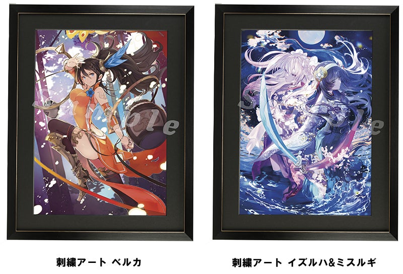 「ラストクロニクル インフィニティ」のカードイラストから、「天地拳聖 ベルカ」「華劍一体 イズルハ&ミスルギ」を刺繍アートにいたします。カード化の際のトリミングをしないイラスト全面をフルカラーで刺繍加工し、イラストの華やかさが立体的に表現されます。