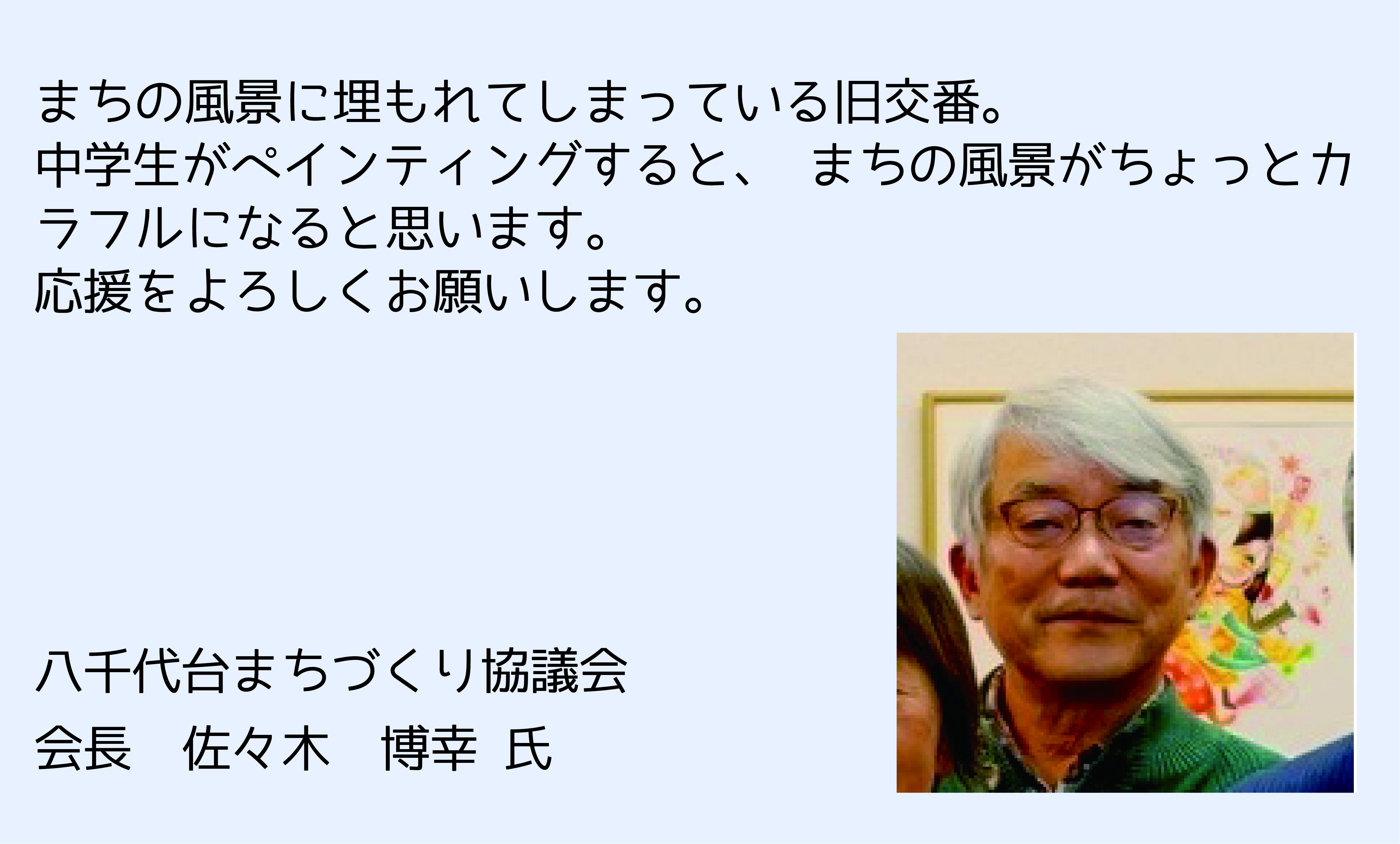 さらに、地元の八千代台西中学校を訪問、校長先生や美術部の皆様と相談し、一緒に楽しくペイントすることとなりました。